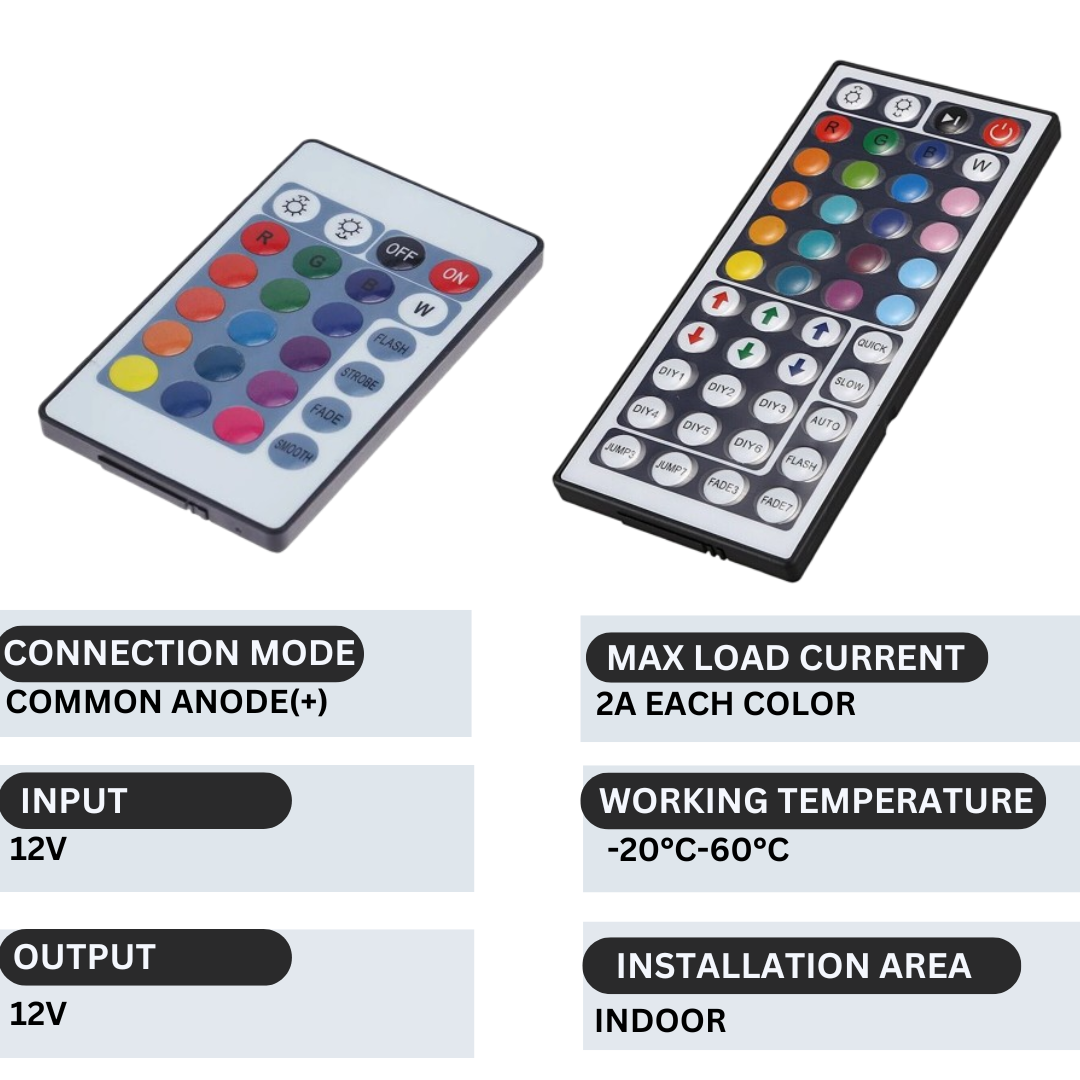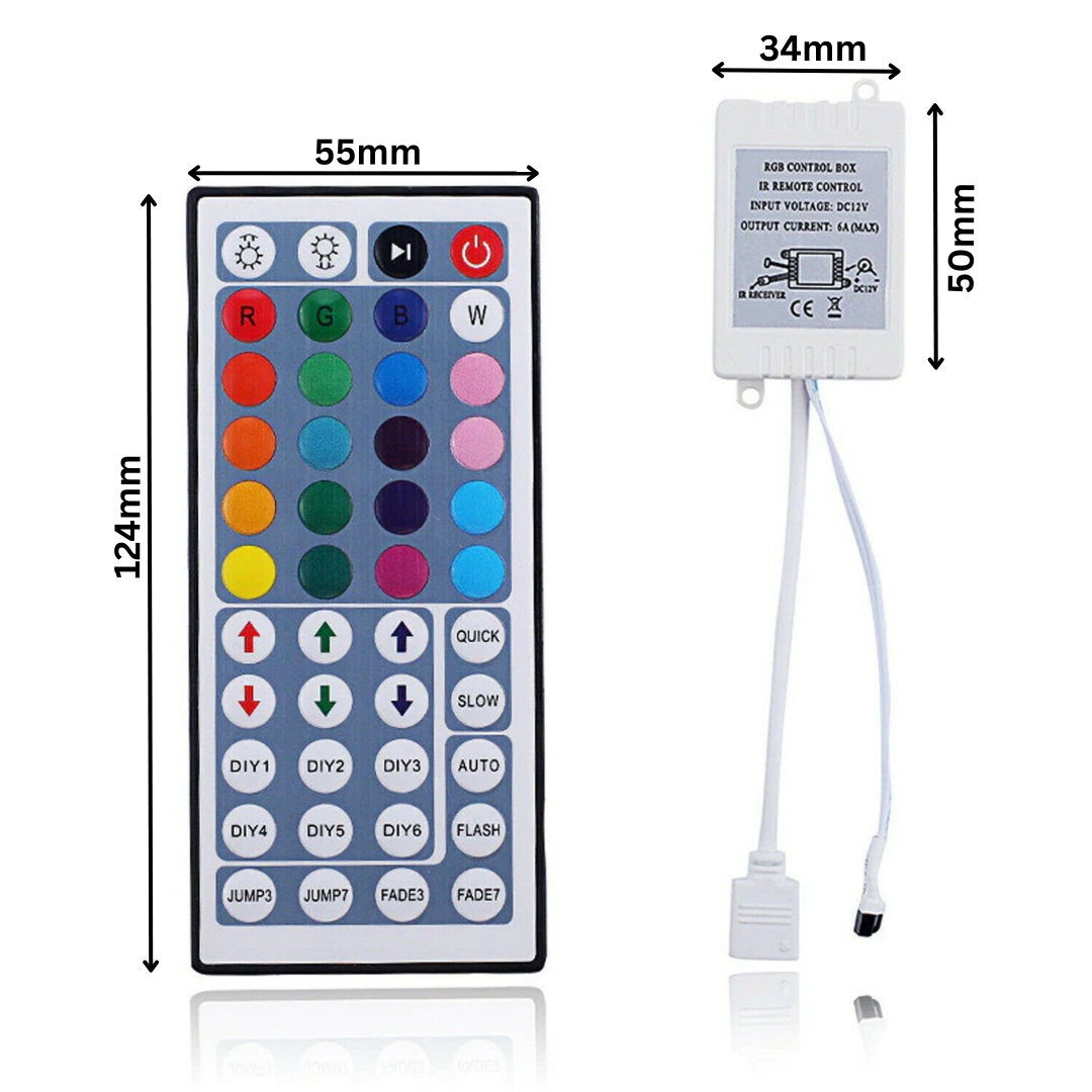 - Infraroodcontroller met 44 toetsen, waarvan 6 toetsen (doe-het-zelftoetsen) voor het opslaan van de kleuren die u wenst.