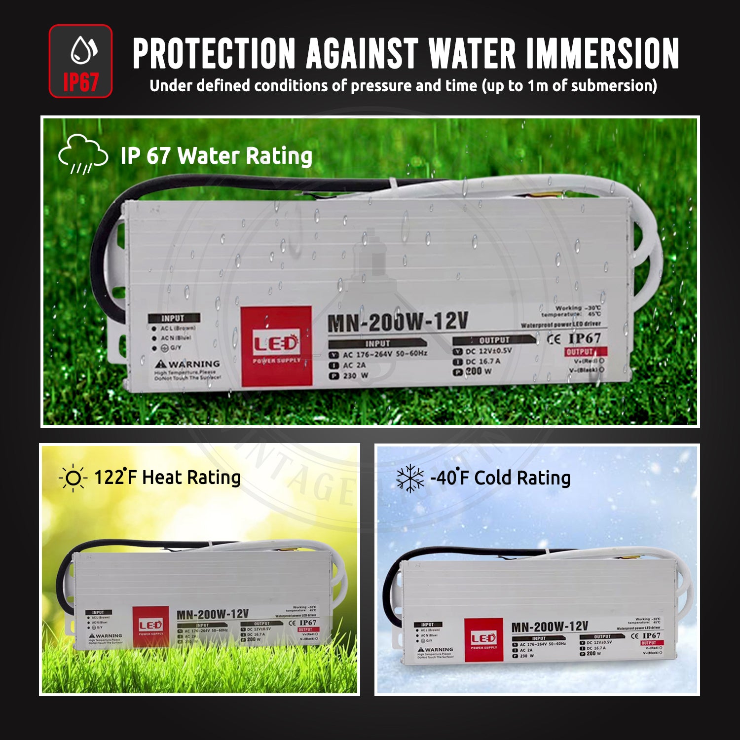 - De LED-driver is ontworpen voor gebruik in een behuizing van aluminiumlegering met rubberen afgedichte kabels, waardoor de LED-driver een IP67-waterdichte beschermingsgraad heeft.