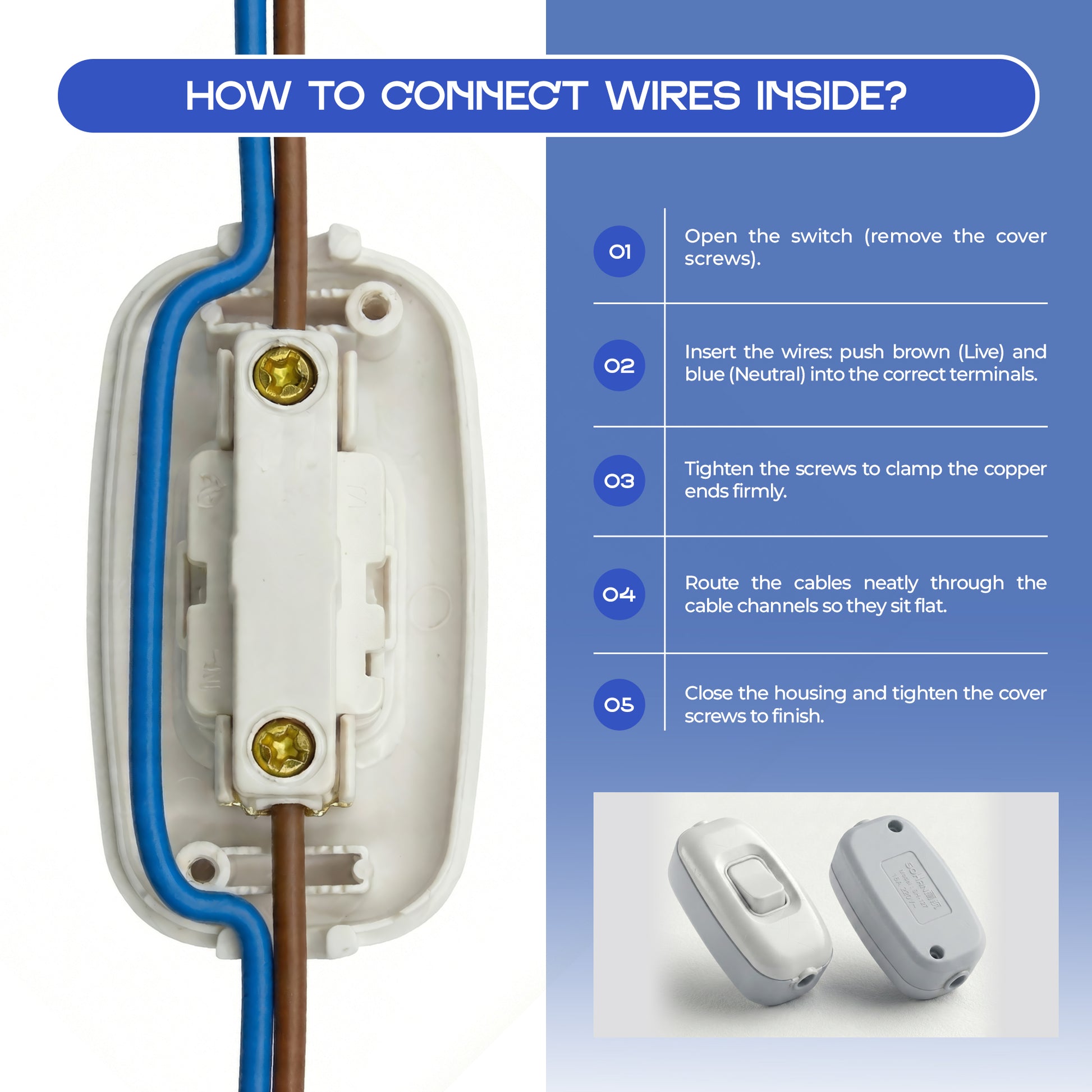 Wiring: Push-fit terminals for live and neutral wires