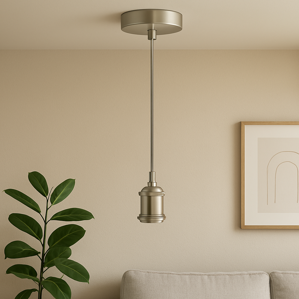 - 1x Hanglampset (vintage, hoog gepolijste lampenhouder met 1 m ronde, grijze stoffen kabel met 3 aders. 1x plafondkap met accessoires) De lamp is niet inbegrepen.