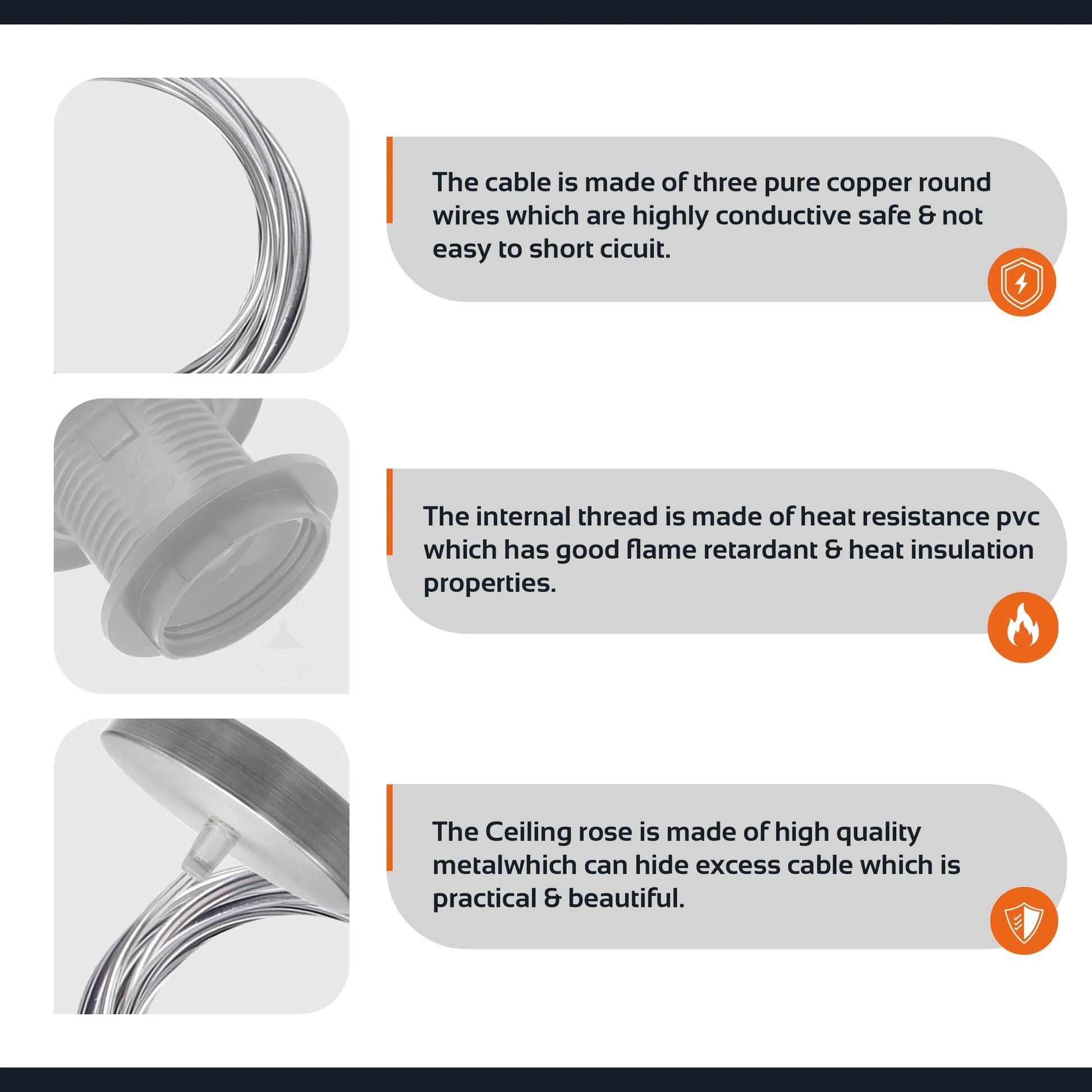 - Inclusief aardleiding voor veilige aarding en conformiteit met de Britse bedrading. Inclusief bevestigingsbeugel voor plafondrozet, schroeven, ringen en bijpassende schroefdoppen.