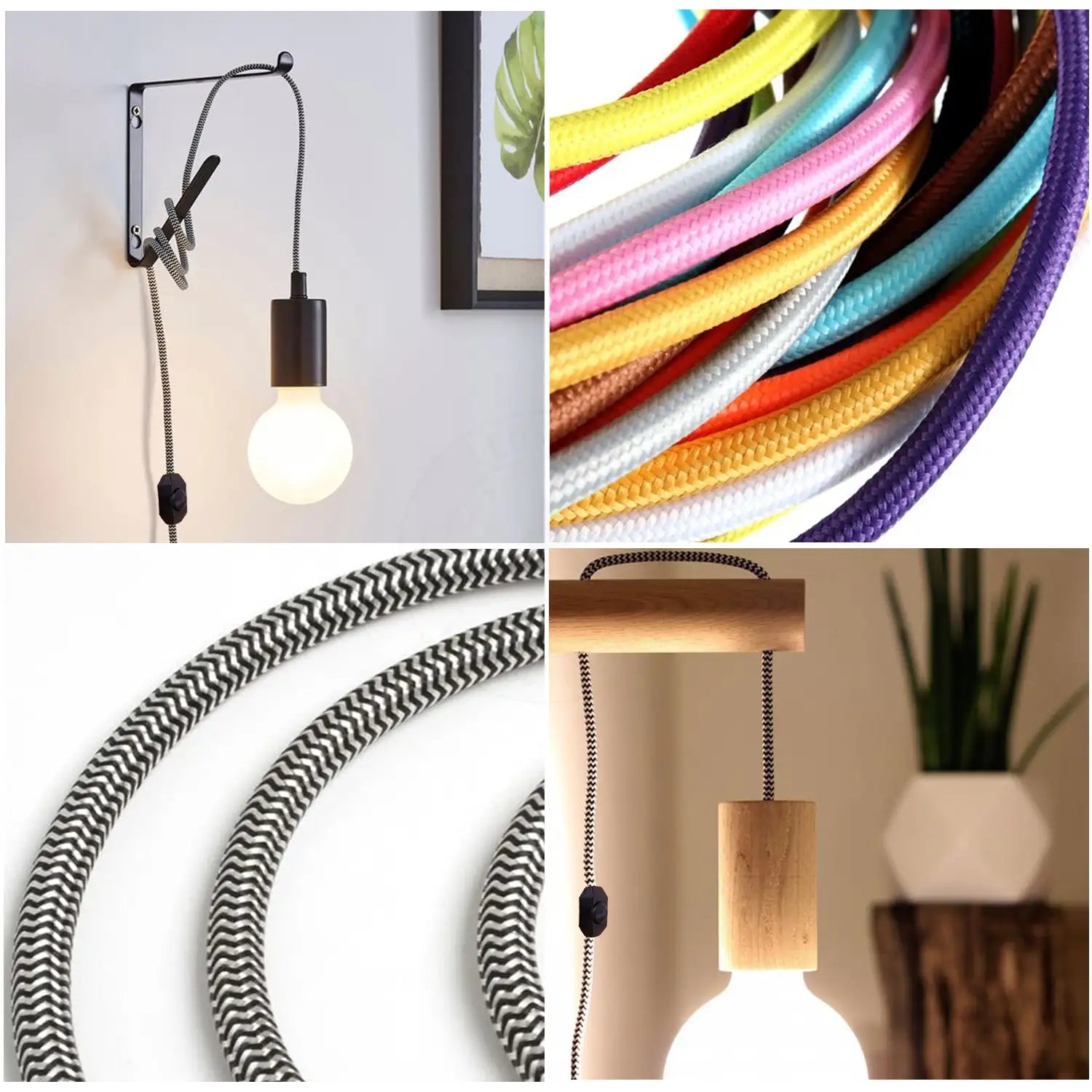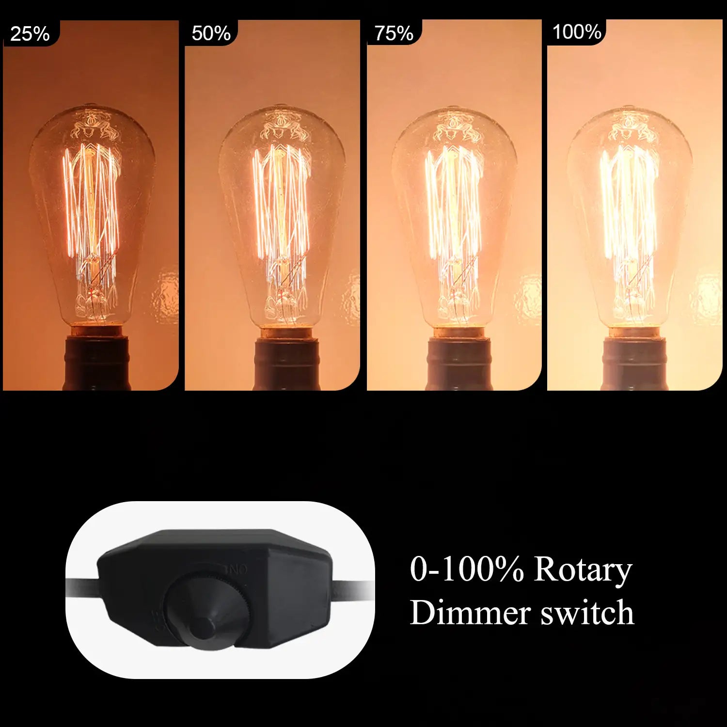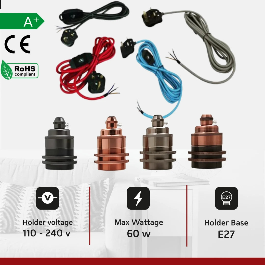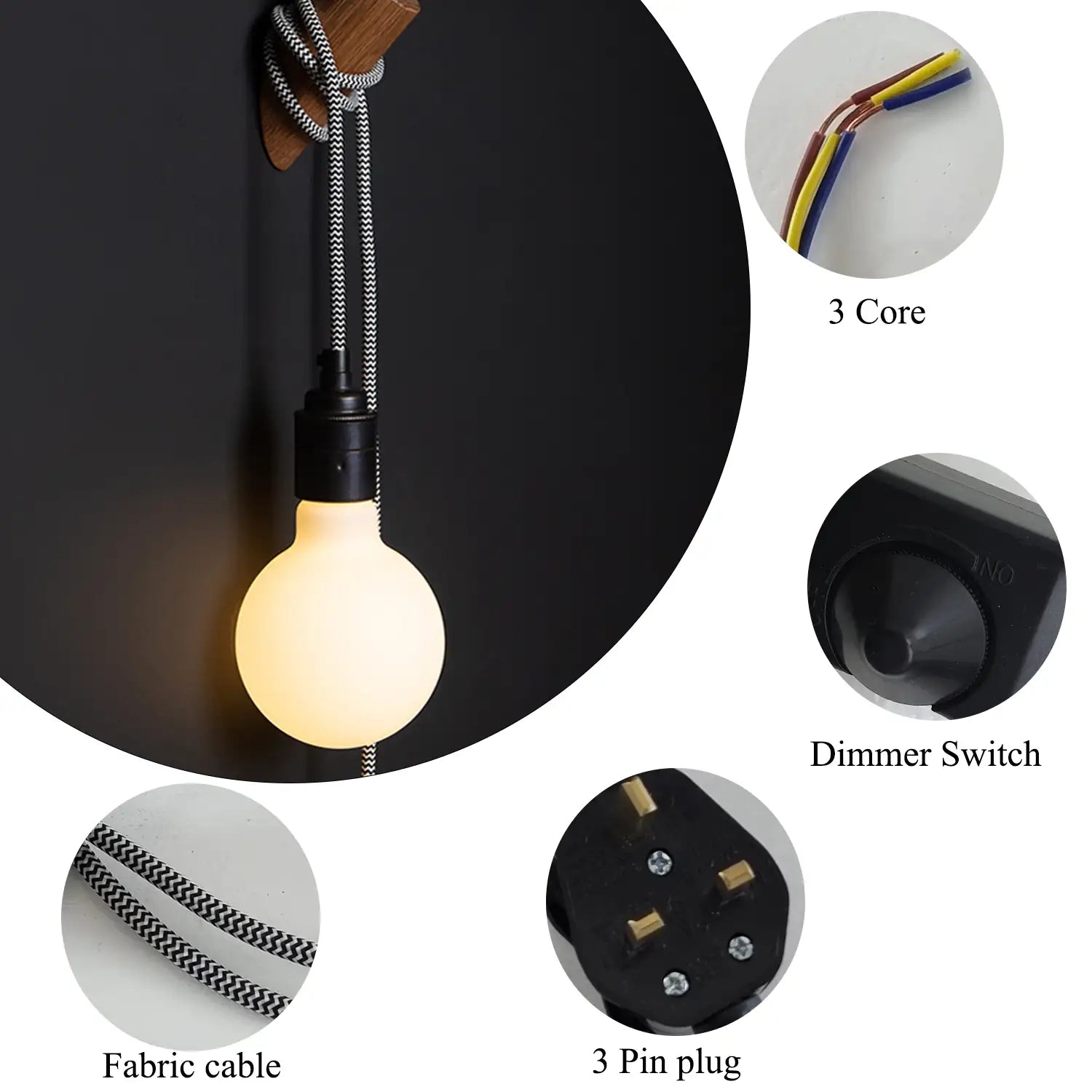 - De set bevat een ES (E27) gegalvaniseerde lamphouder en een 4,5 m/2 m lange, drieaderige, gevlochten stoffen kabel met een 3-pins stekker en een ingebouwde dimmer. U hoeft deze alleen maar aan te sluiten op de lamphouder. Er wordt ook een kabelklem meegeleverd om de kabel op zijn plaats te houden.