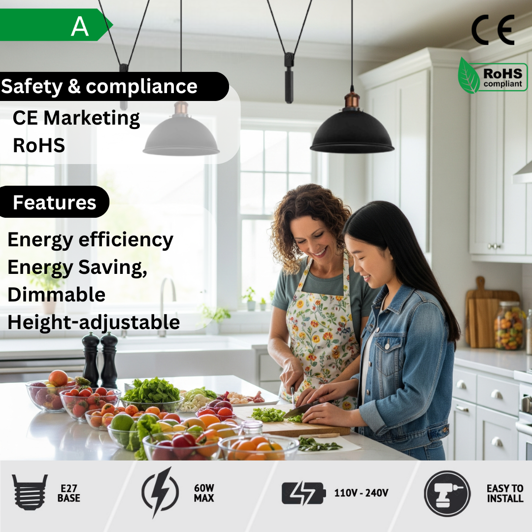 Metal Shaded 2M Adjustable Pendant Light with Pulley System – Vintage-Modern Industrial Design for Every Room
