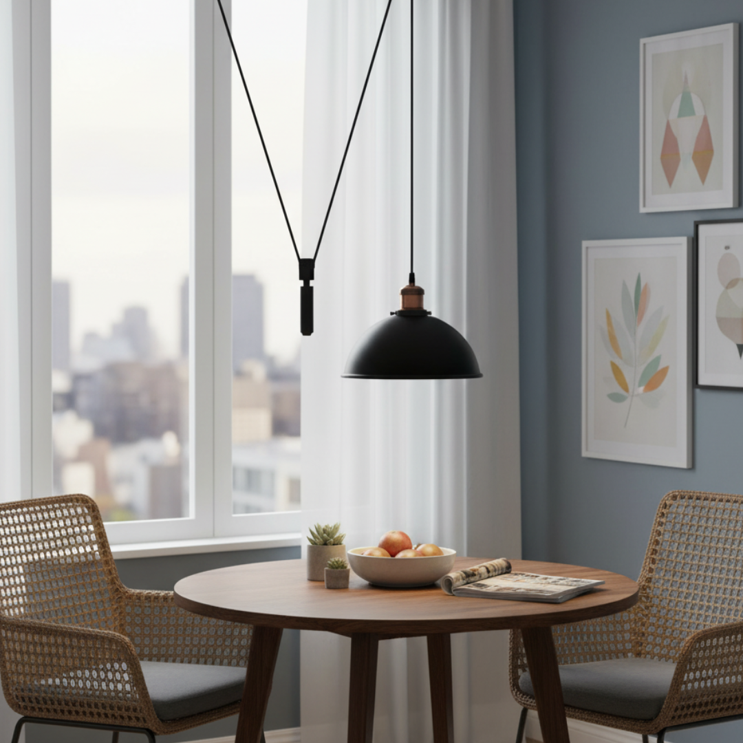 - Bring the best of vintage-industrial lighting to your home with the 2M Adjustable Pendant Light with Pulley System. Its sleek design, adjustable height, and durable materials make it the perfect choice for modern interiors.