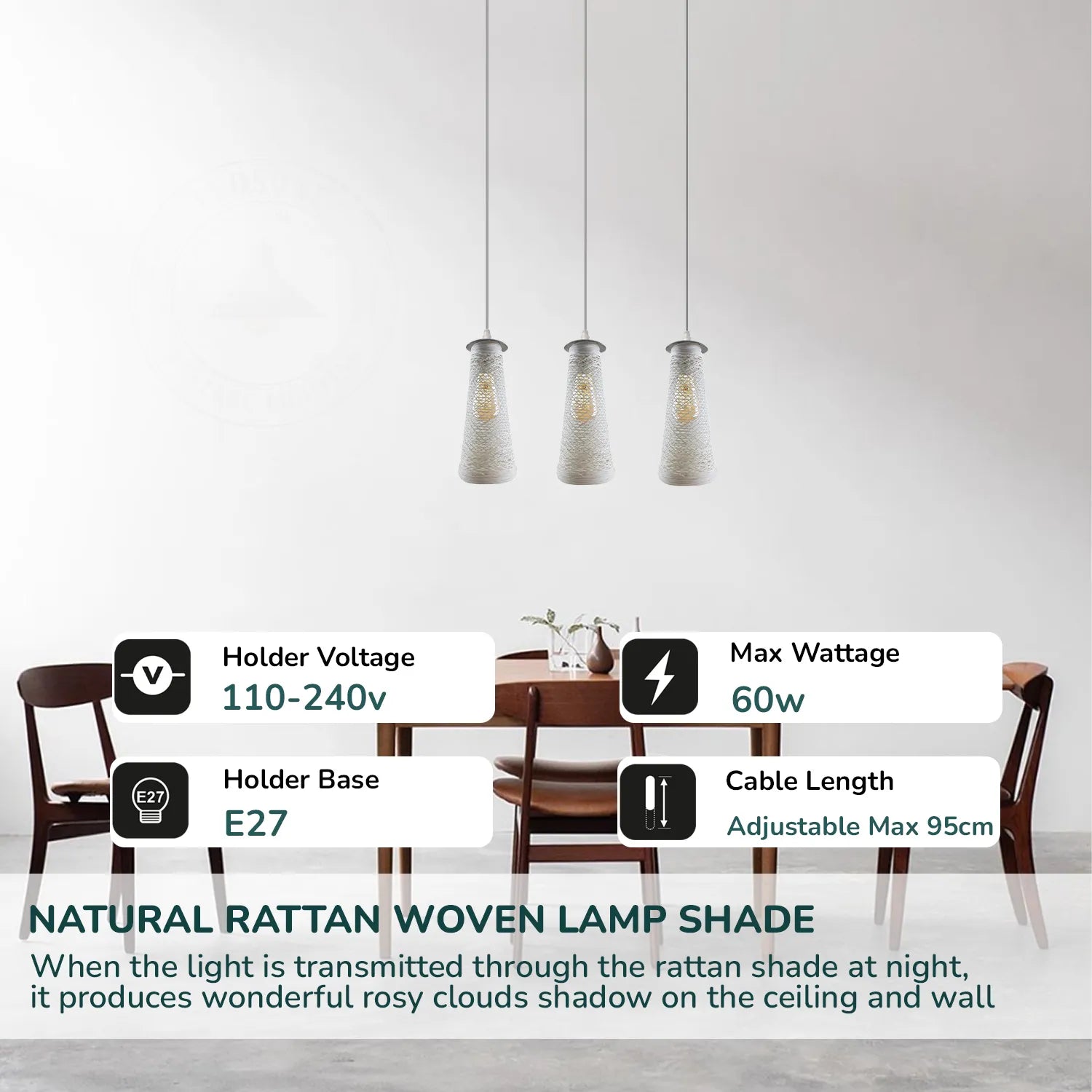 - Drie handgemaakte, gevlochten rotan lampenkappen geven de lamp een natuurlijke en aardse uitstraling en voegen een rustieke toets toe aan uw ruimte.