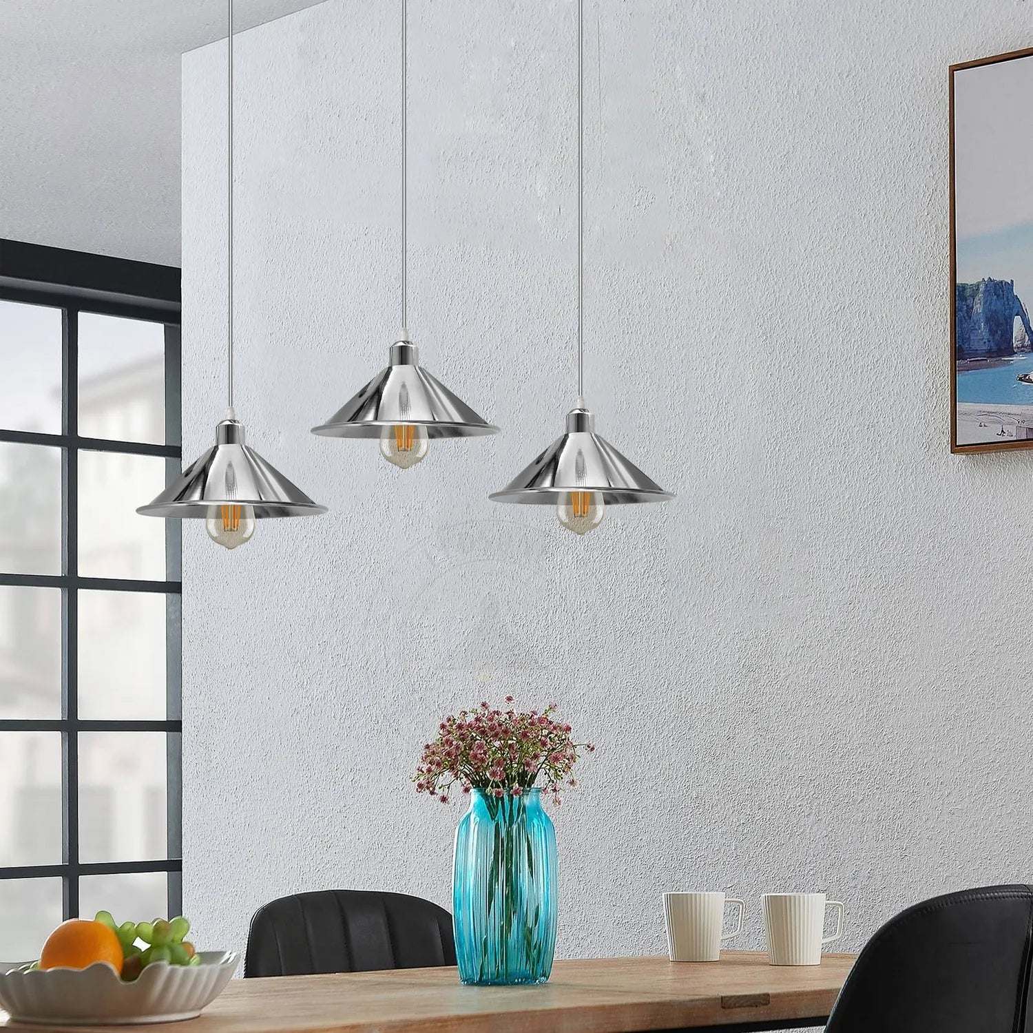 - Ziet er aantrekkelijk en modieus uit in uw bestaande lampenkap. De kegelvormige fitting van de hanglamp schijnt naar beneden en creëert een warme en gezellige sfeer.