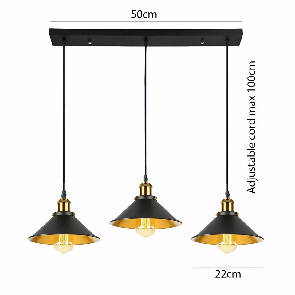- Hanglamp met drie lampen, geheel naar uw wensen en design. Rechthoekig plafond in industriële stijl. Eenvoudig en verfijnd. Verkrijgbaar in kleuren die vakkundig gecombineerd worden met een metalen kap.