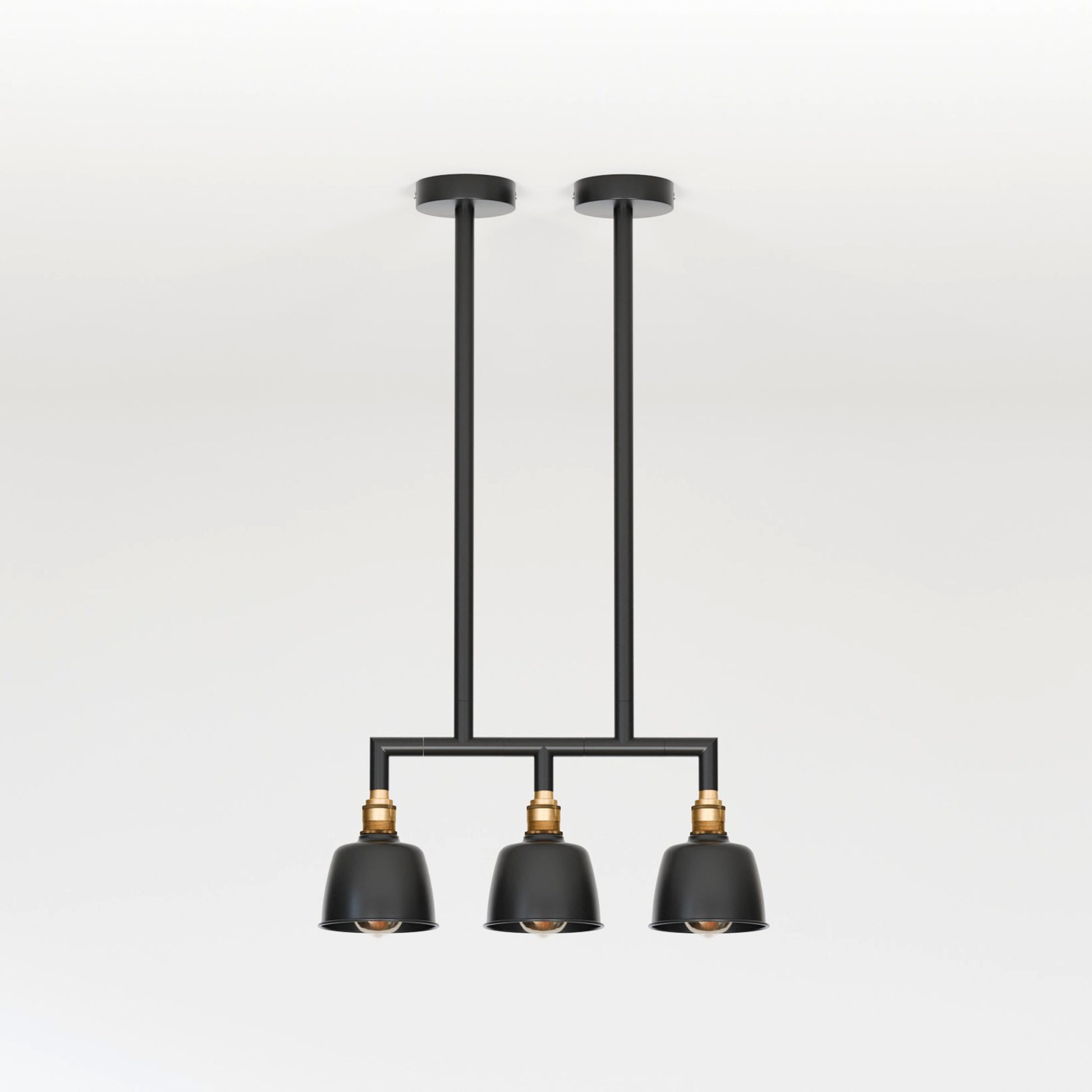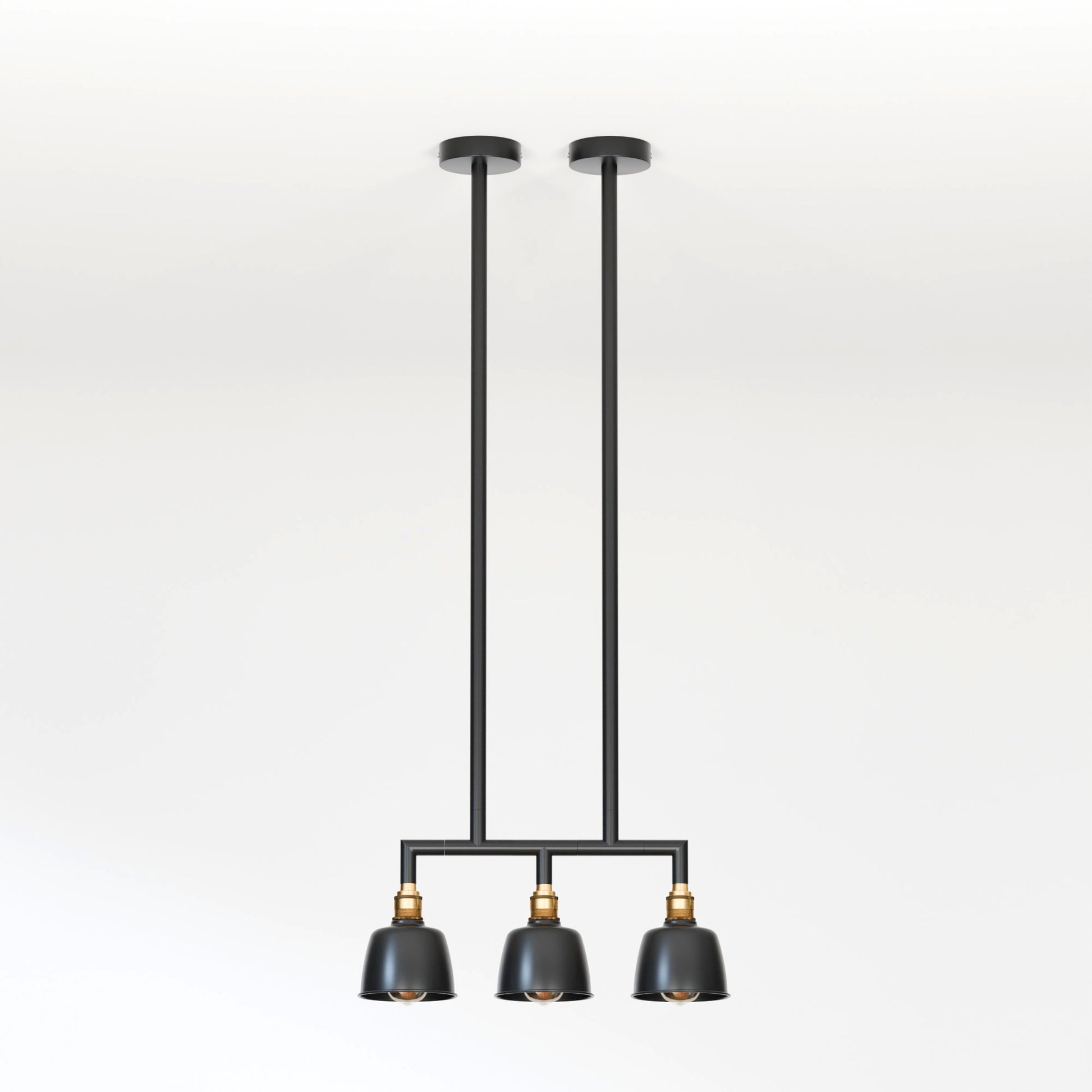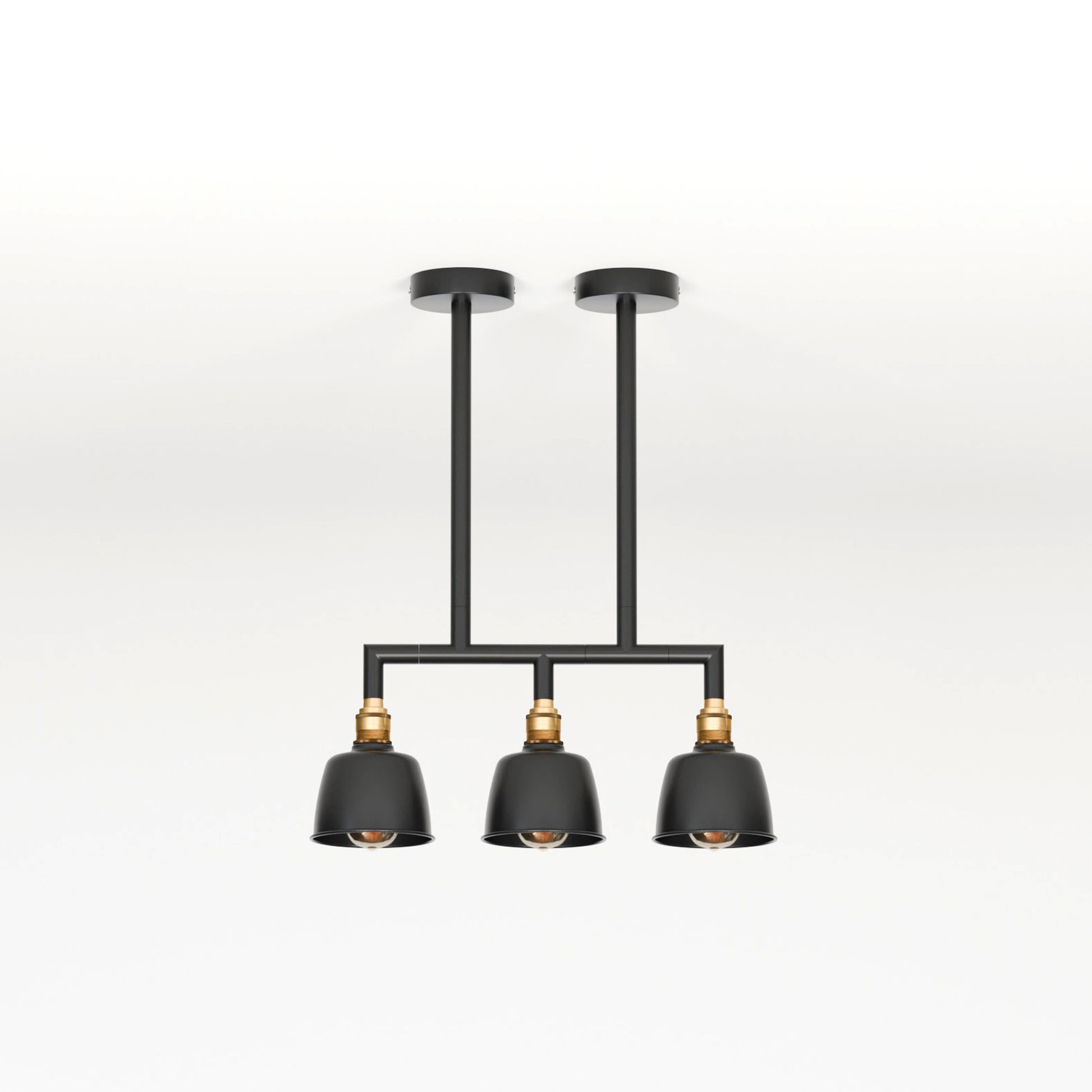 - Een drievoudige hanglamp met een industrieel ogend buizenframe en drie koepelvormige kappen, ontworpen om een gedurfde en stijlvolle vintage charme aan elke moderne ruimte toe te voegen