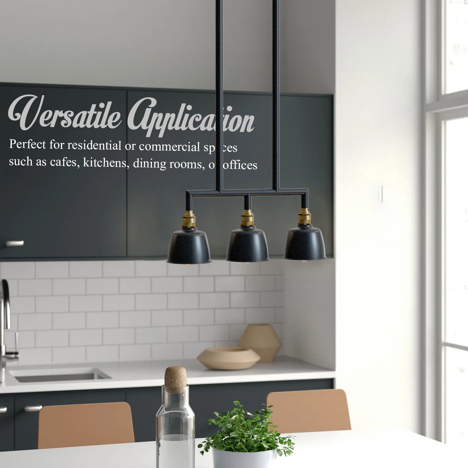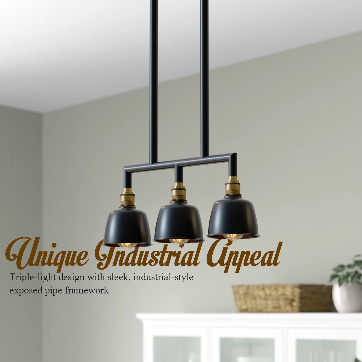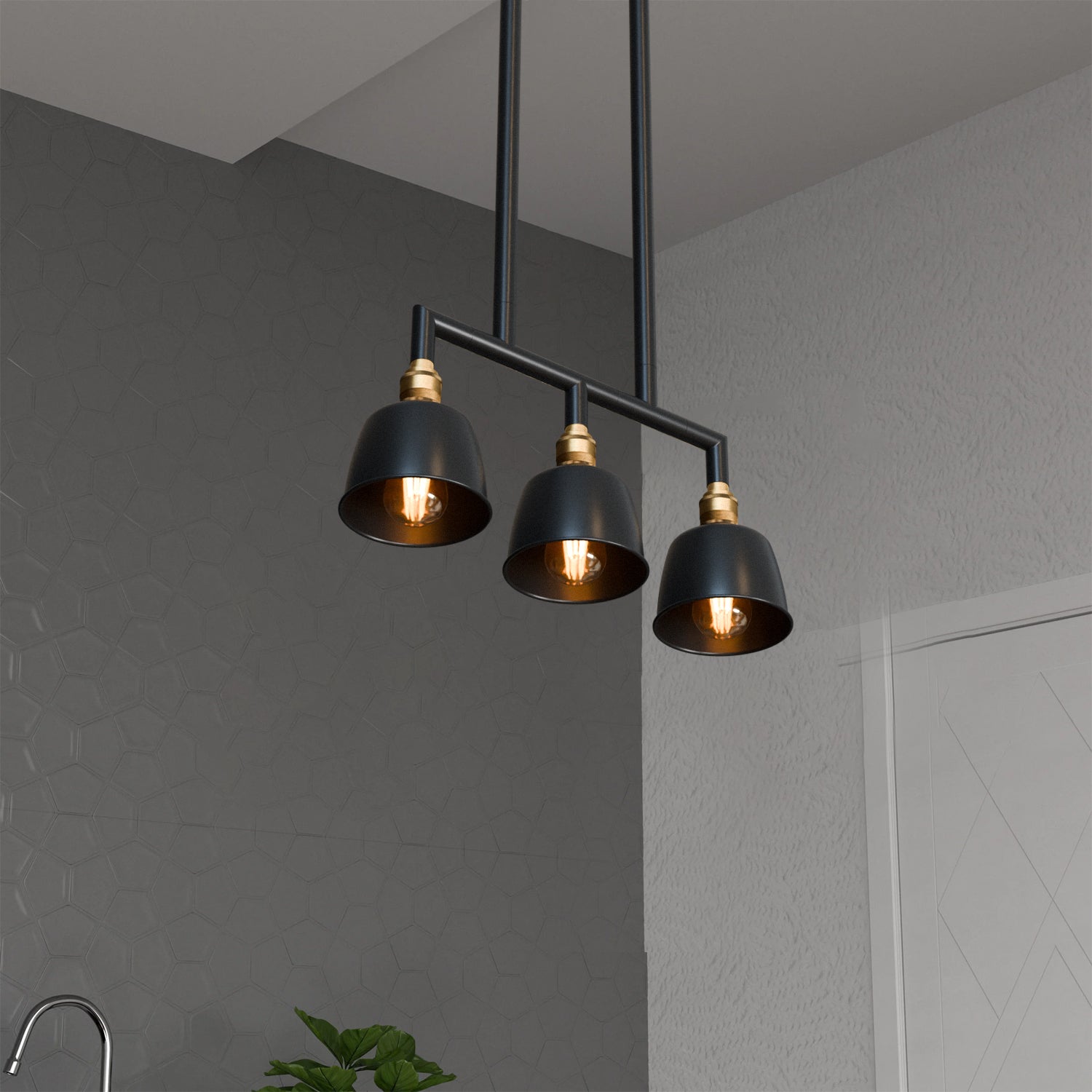 - Een drievoudige hanglamp met een industrieel ogend buizenframe en drie koepelvormige kappen, ontworpen om een gedurfde en stijlvolle vintage charme aan elke moderne ruimte toe te voegen