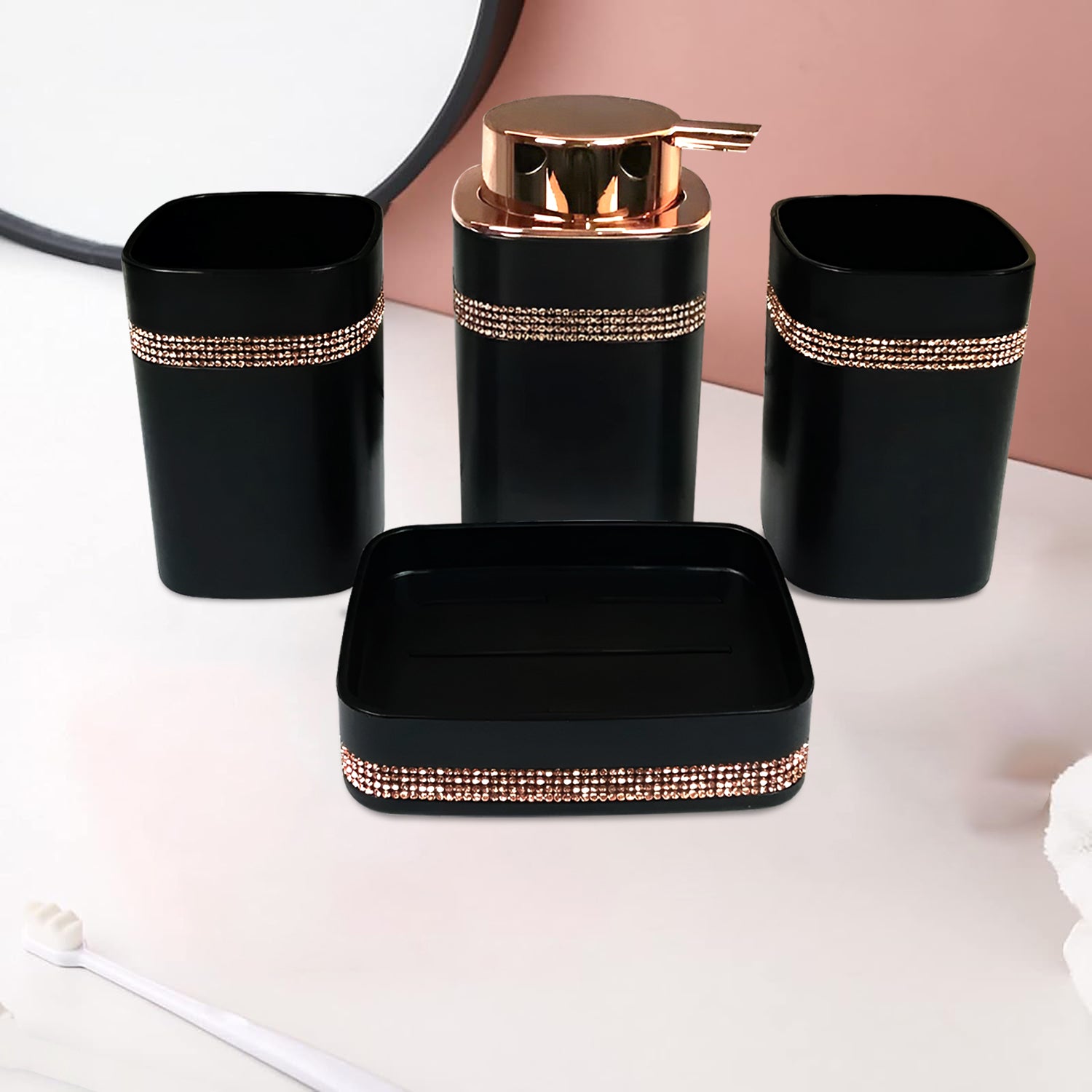 - Deze set, bestaande uit een tandenborstelhouder, lotiondispenser, beker en zeepbakje, zal de sfeer in uw badkamer verbeteren.