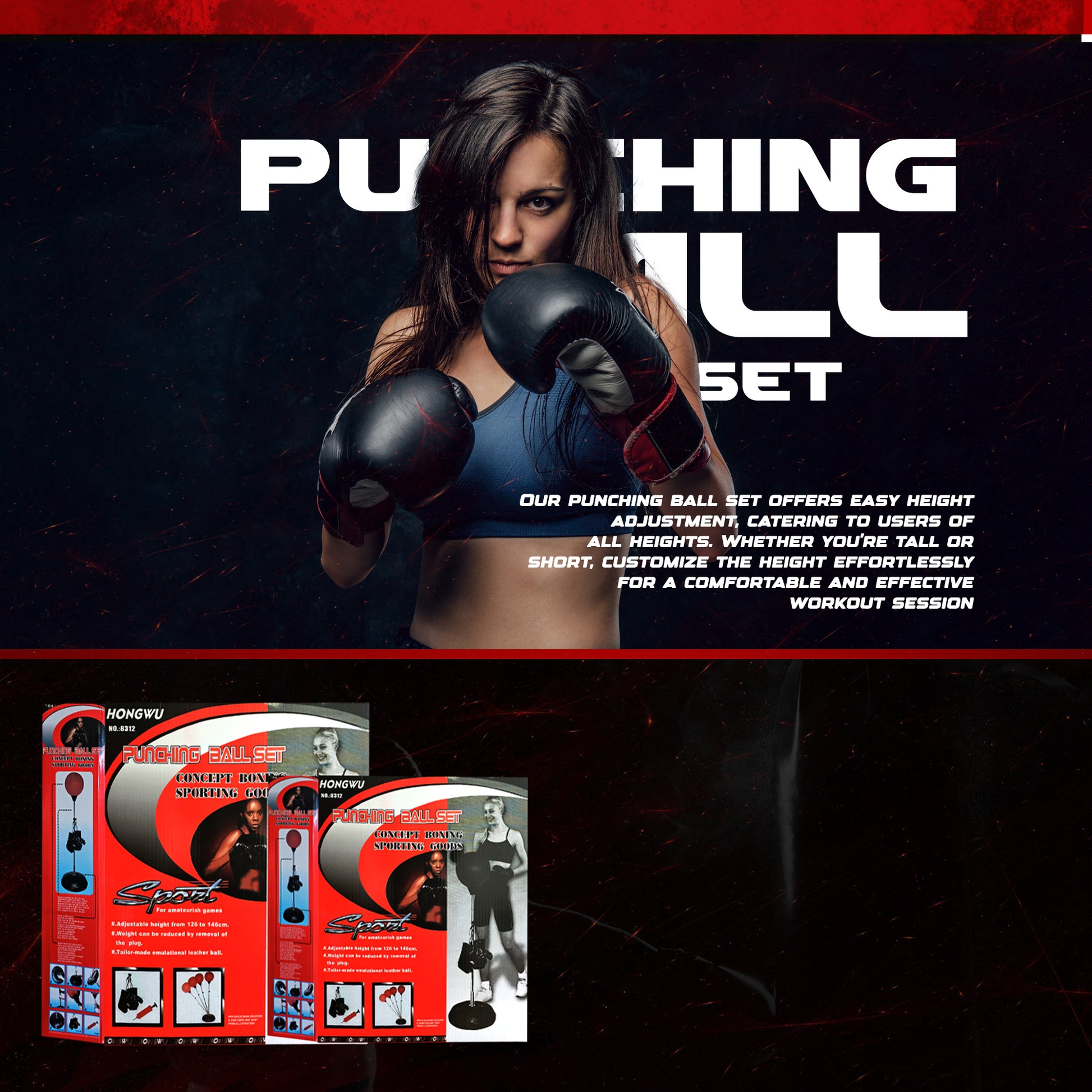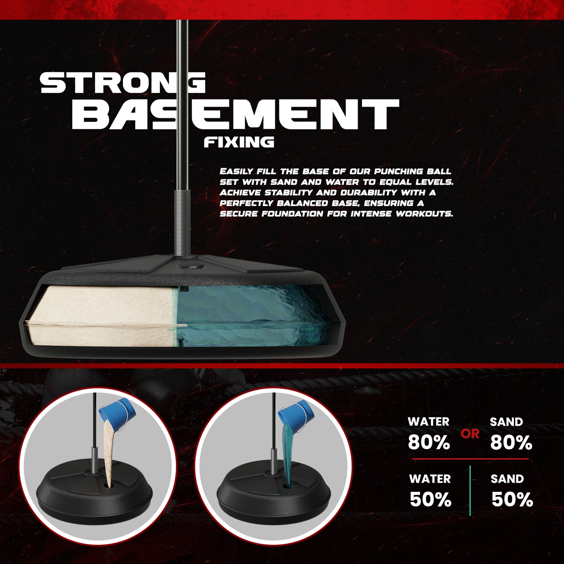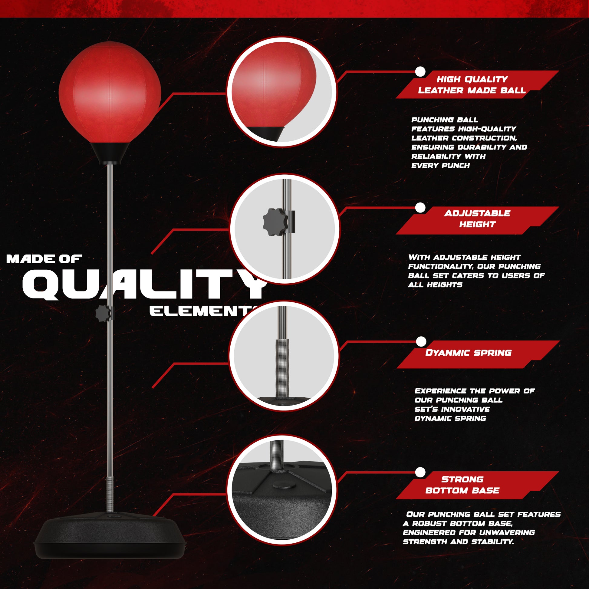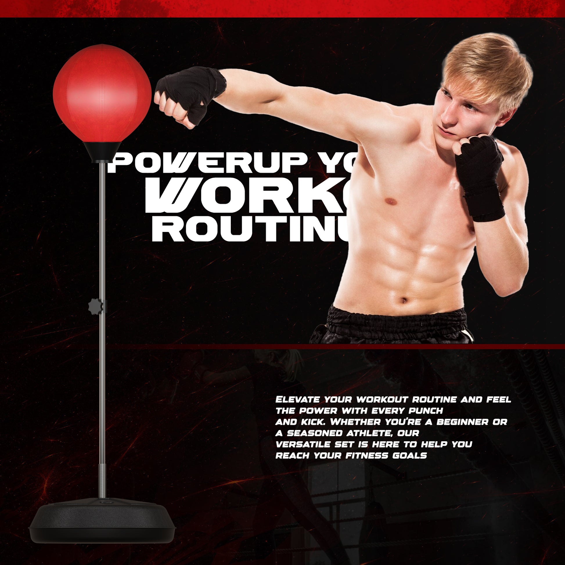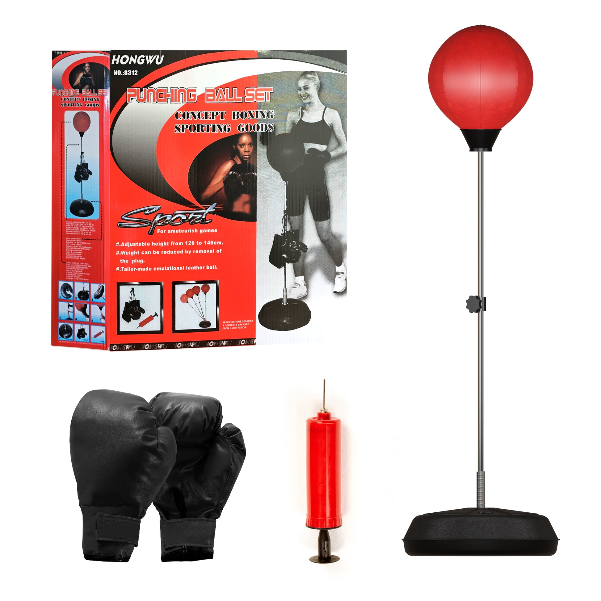 - De boksbalset bestaat uit een vrijstaande boksbal met handschoenen en een luchtpomp, met een gebalanceerde basis gevuld met zand en water voor stabiliteit.