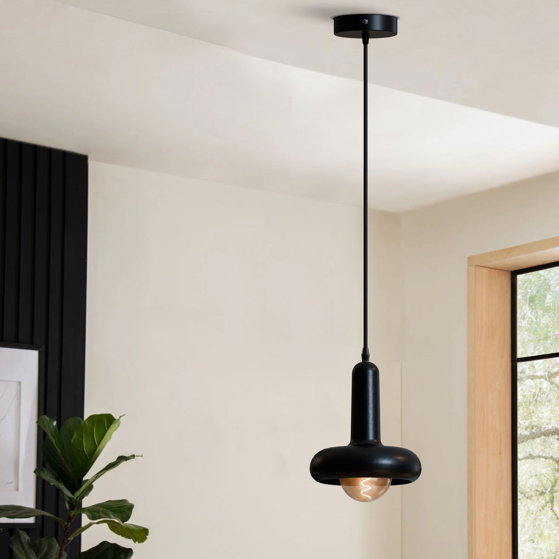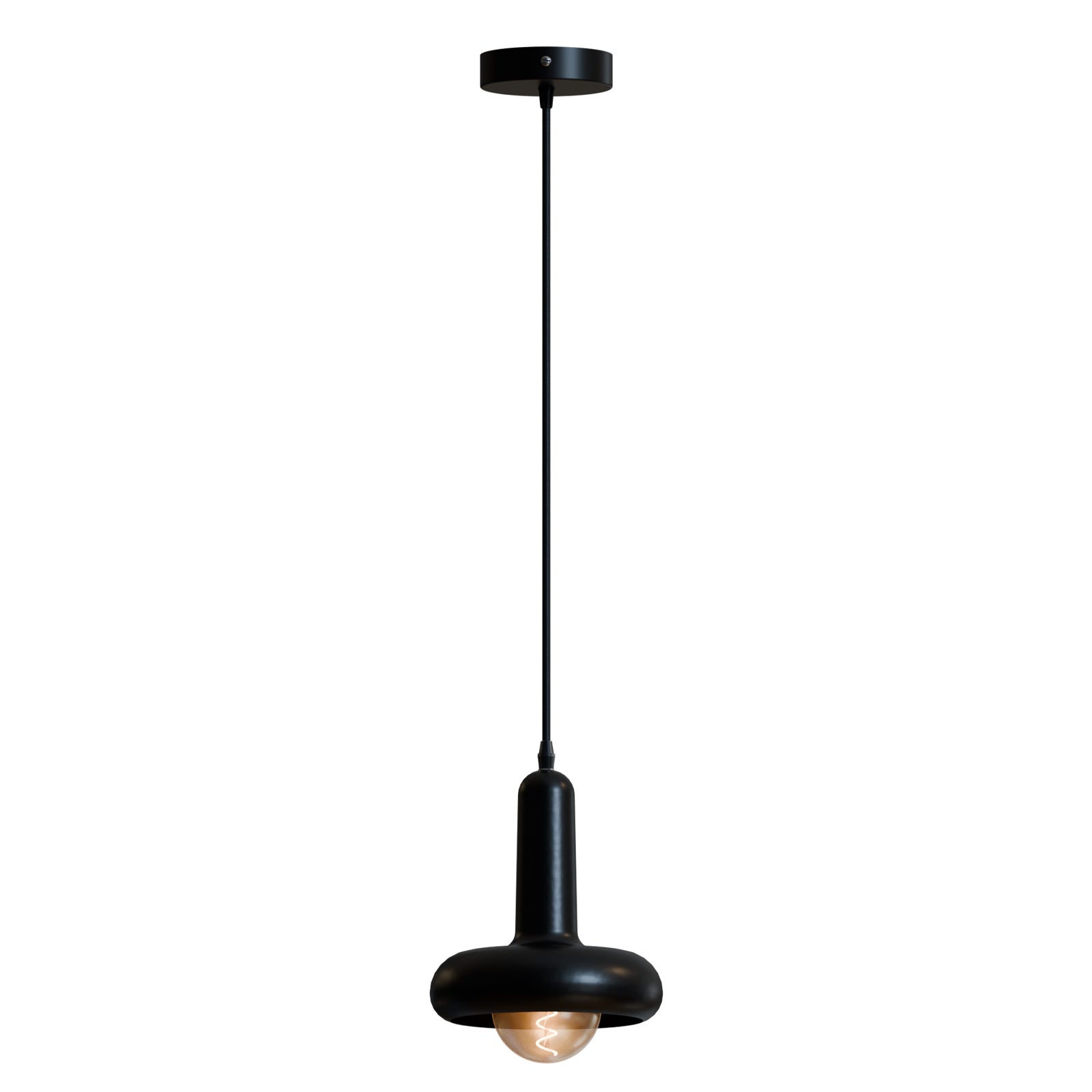 - Deze moderne, zwarte hanglamp heeft een unieke, ronde, paddenstoelvormige lampenkap met een gladde, matte afwerking.