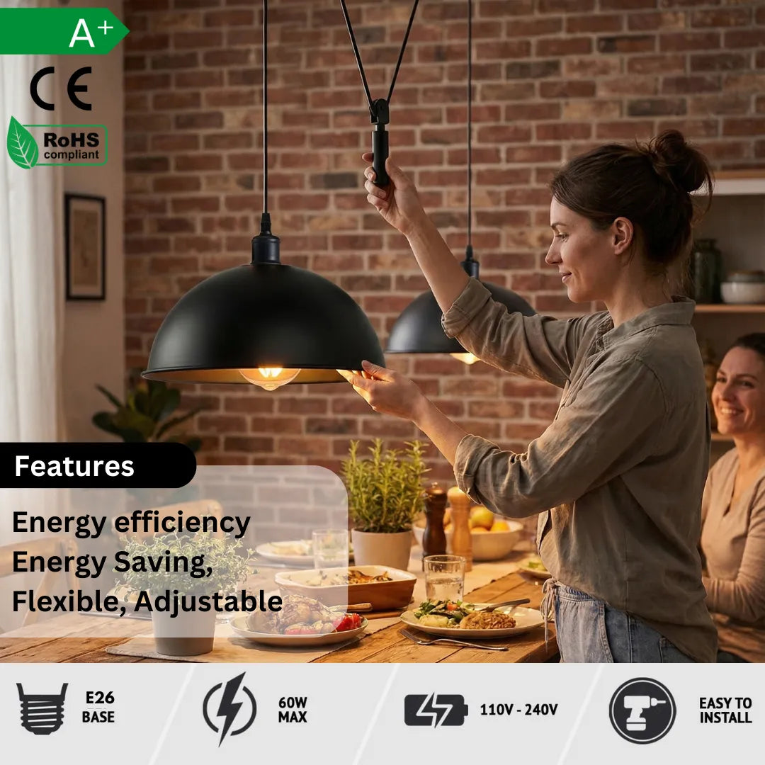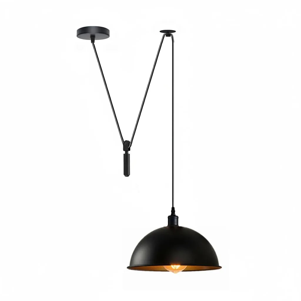 Bring the perfect blend of vintage mechanics and modern style to your home with the Industrial Rise and Fall Pendant Light. This 40cm black dome fixture features a fully functional pulley system, making it an ideal choice for dynamic lighting in kitchens, dining areas, and workspaces.