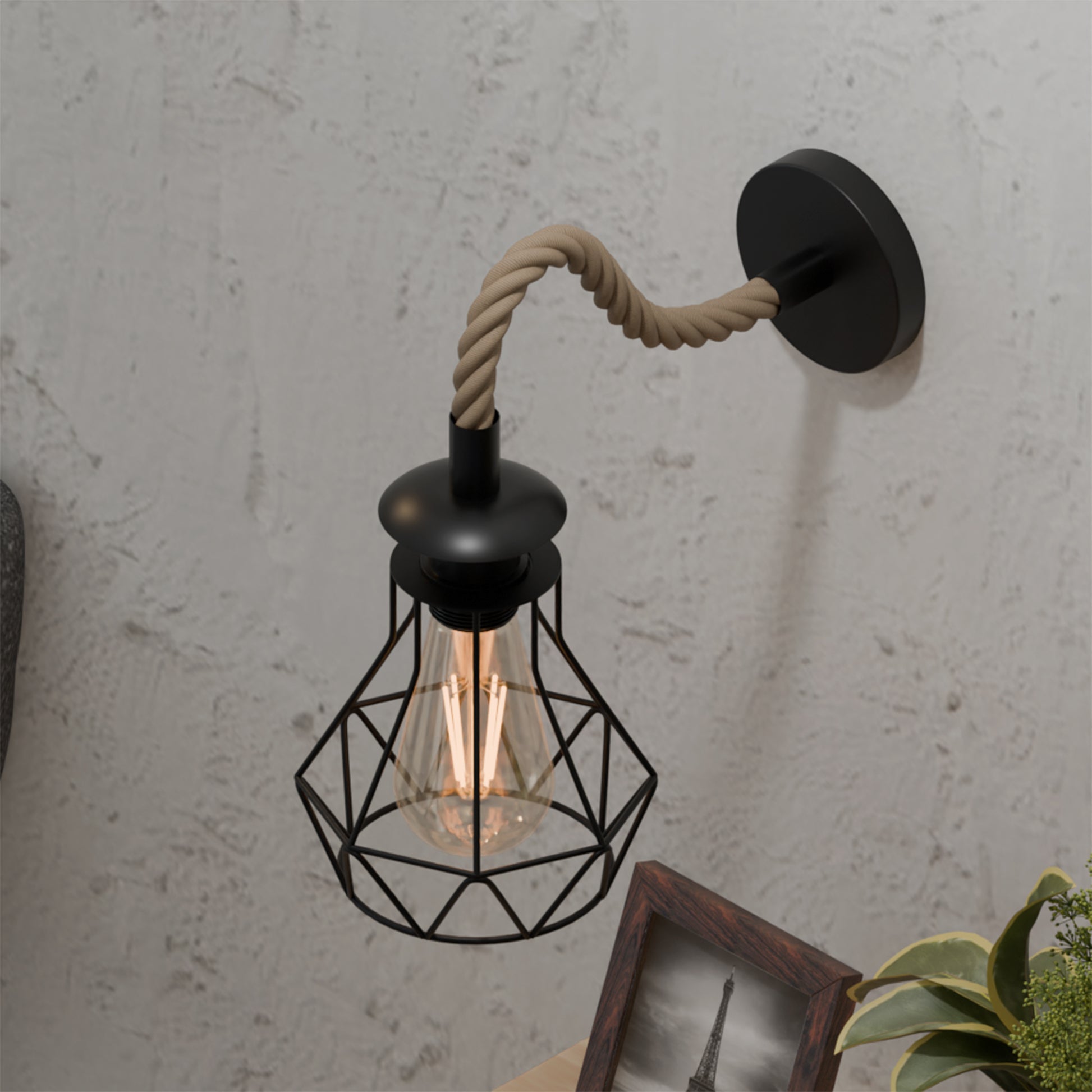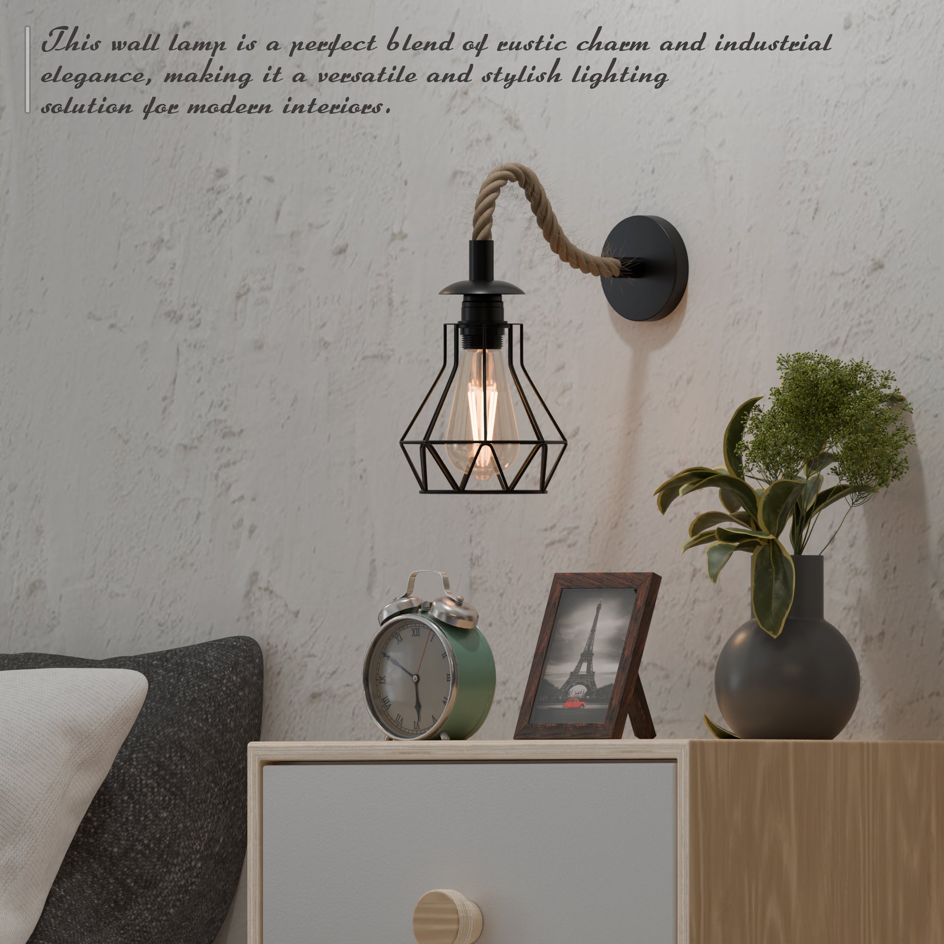 • Stijlvolle, vintage wandlamp met een gedraaide, met henneptouw omhulde kabel met kap, ideaal voor interieurdecoratie.