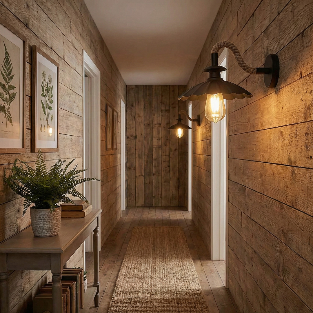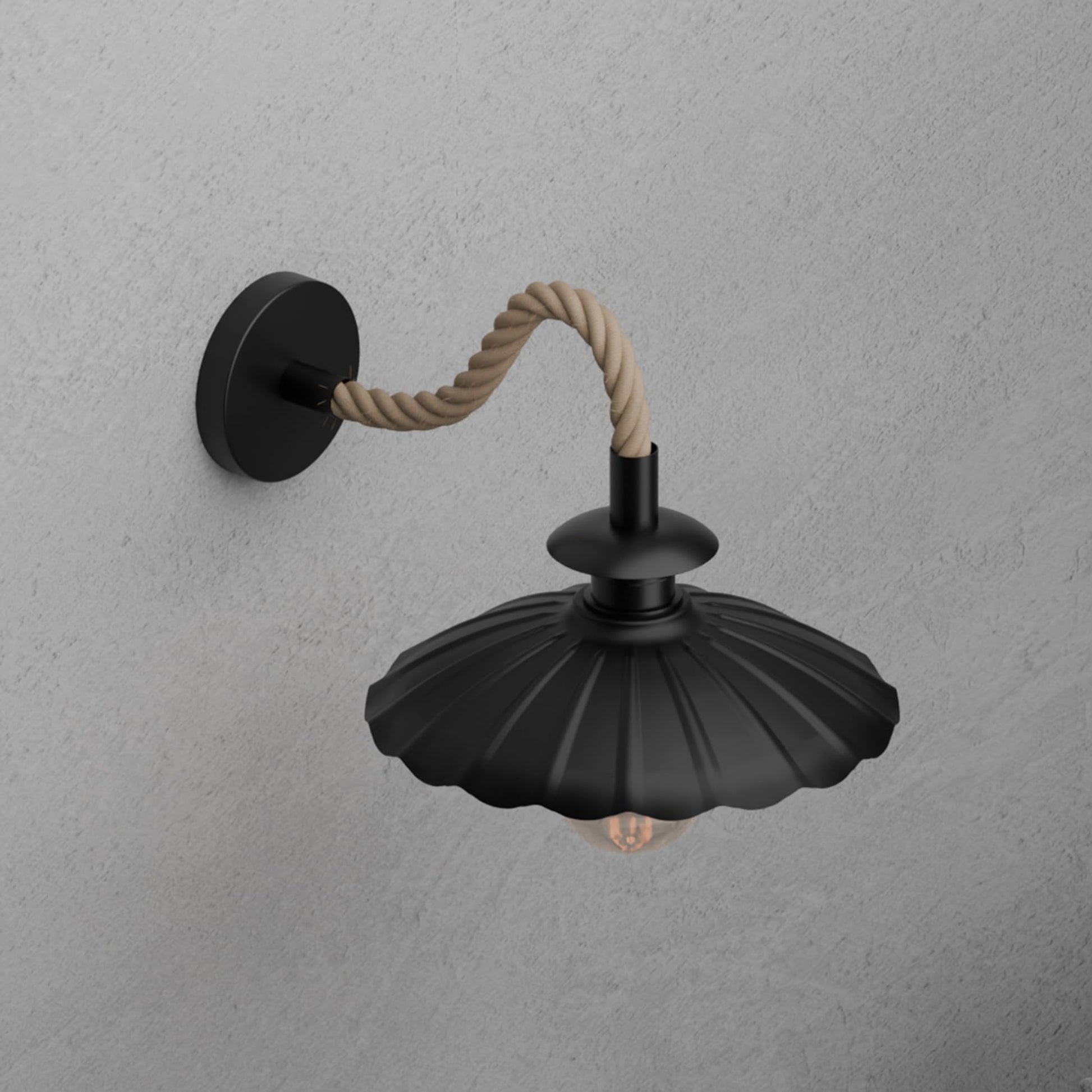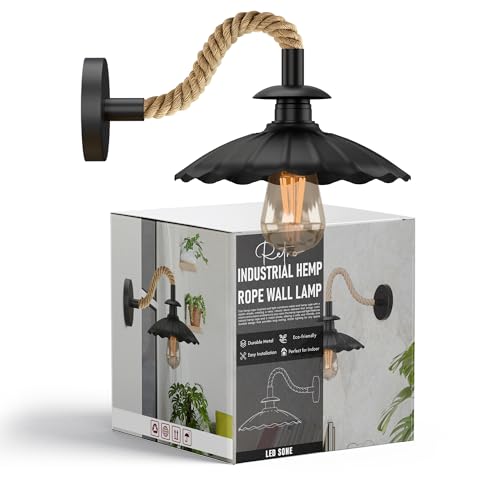 • Stijlvolle, vintage wandlamp met een gedraaide, met henneptouw omhulde kabel met kap, ideaal voor interieurdecoratie.