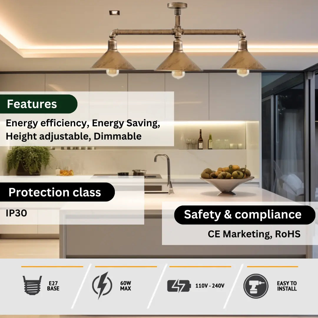 - Geschikt voor 3 E27 Edison-schroeflampen van elk maximaal 60 W (lampen zijn niet inbegrepen)