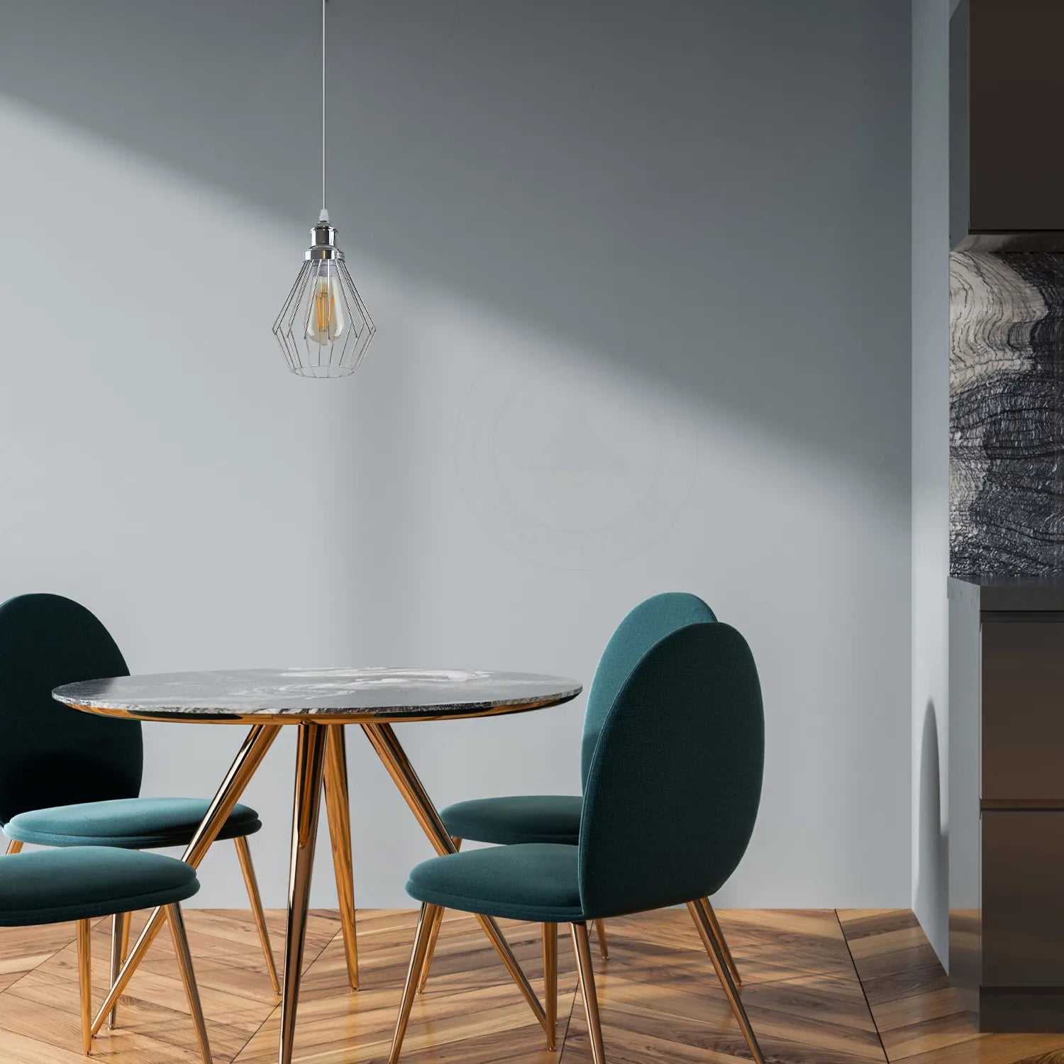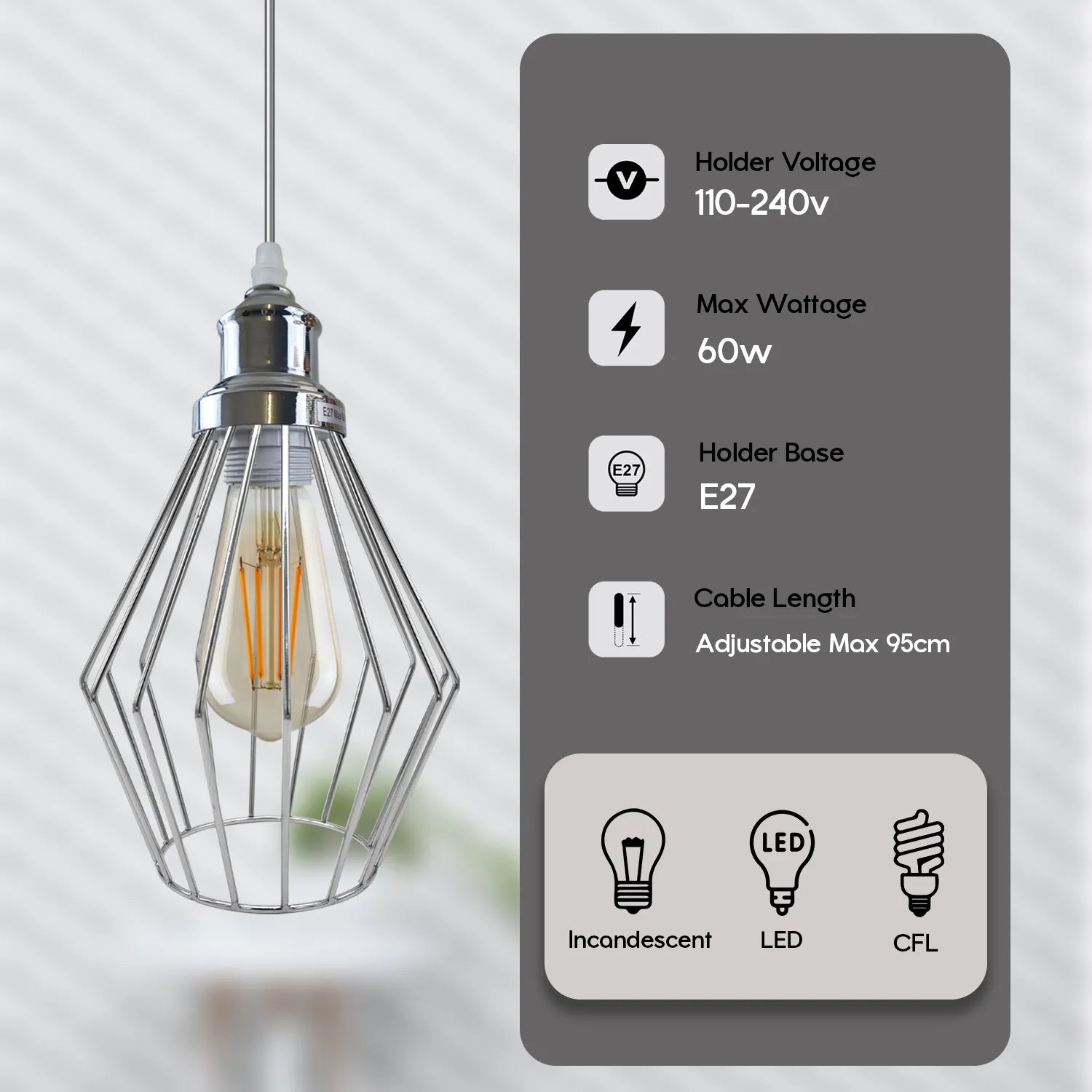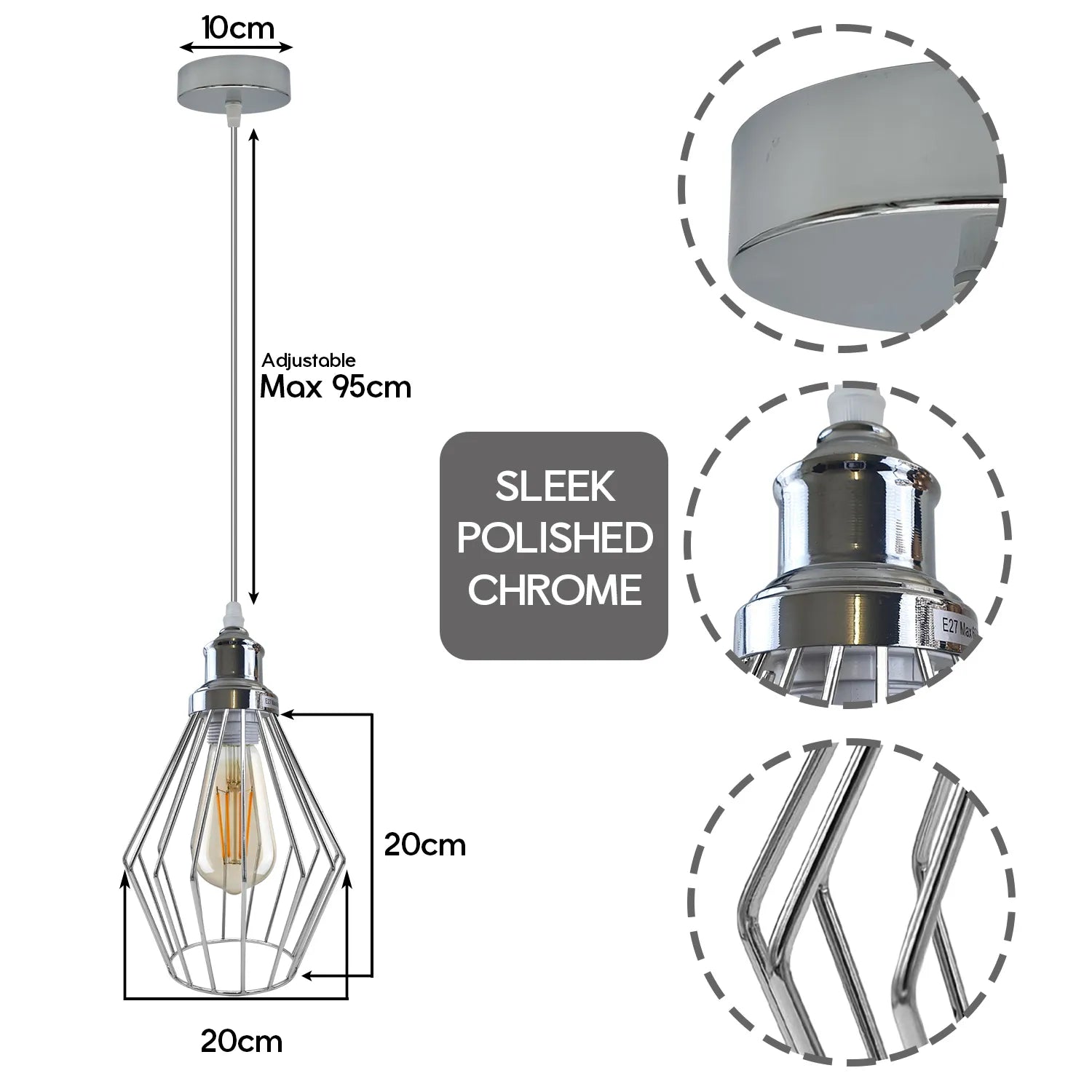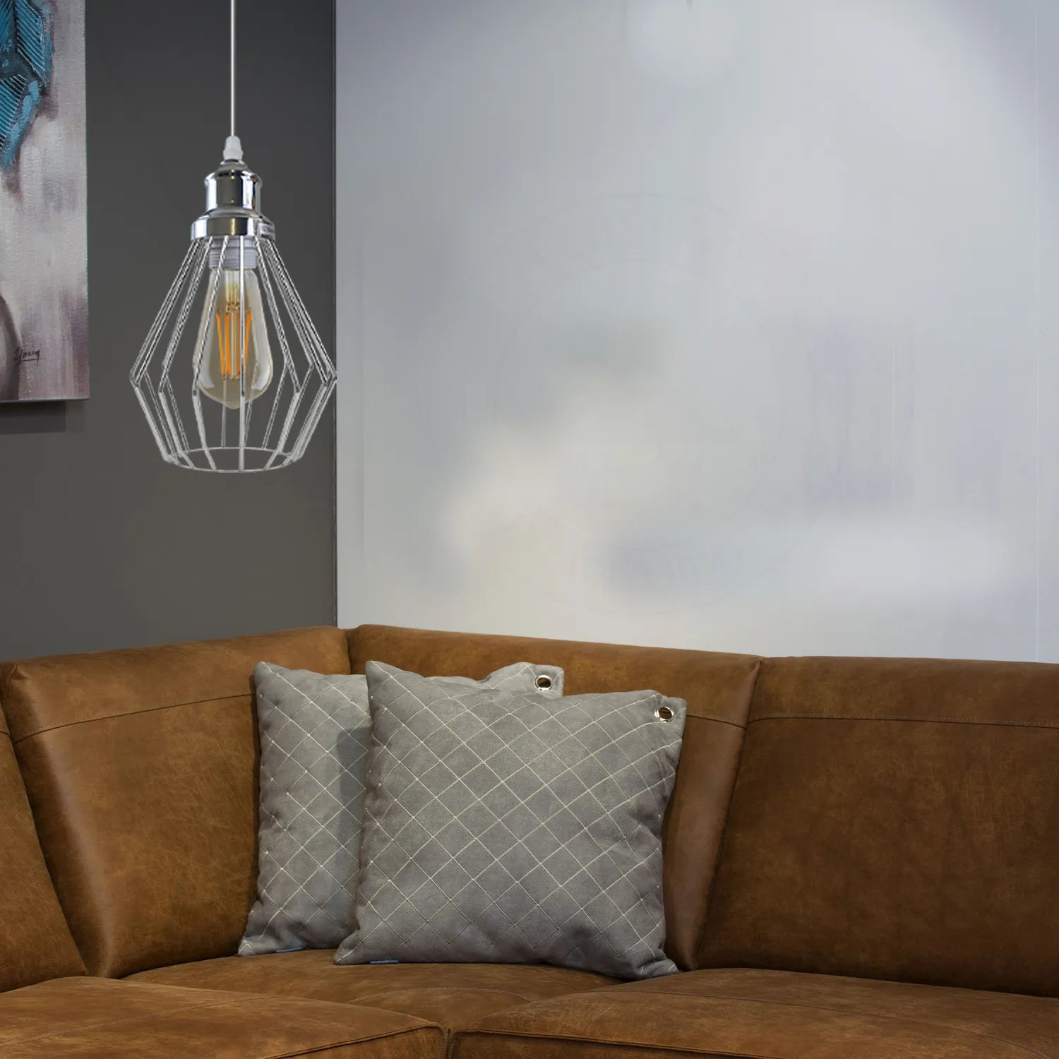 - Deze plafondlamp met open kooi van chroom heeft een ruitvormig ontwerp en geeft de lamp een industriële uitstraling, waardoor hij goed past bij rustieke interieurs.