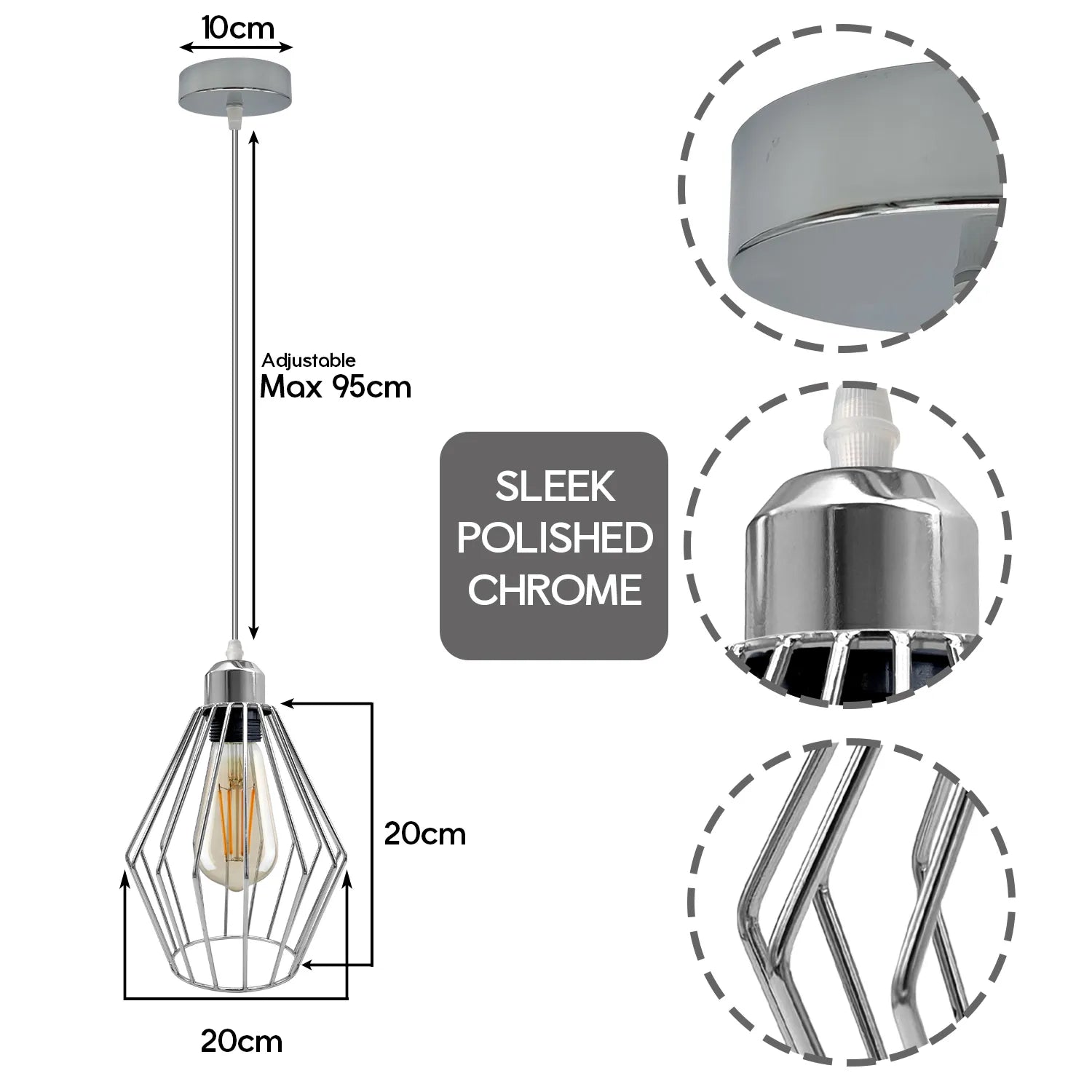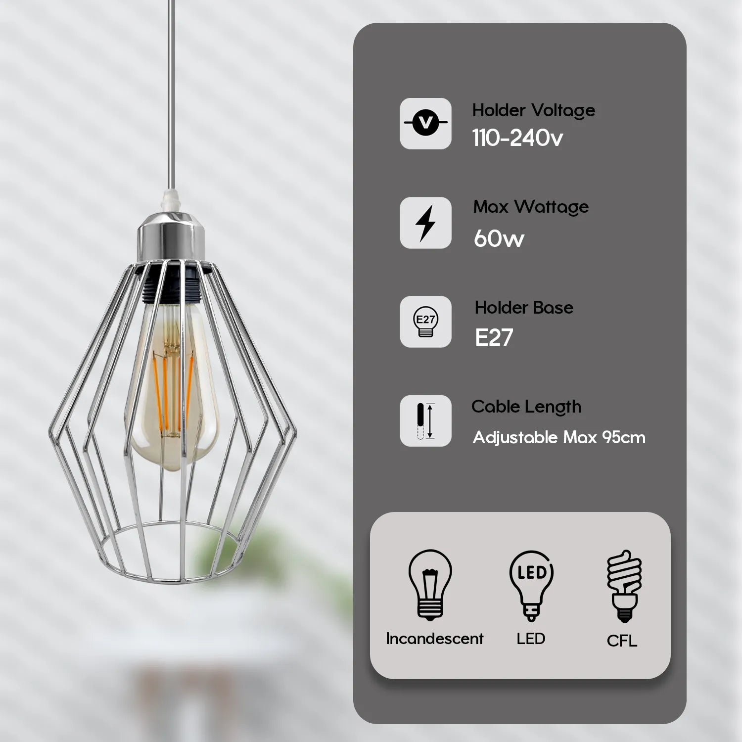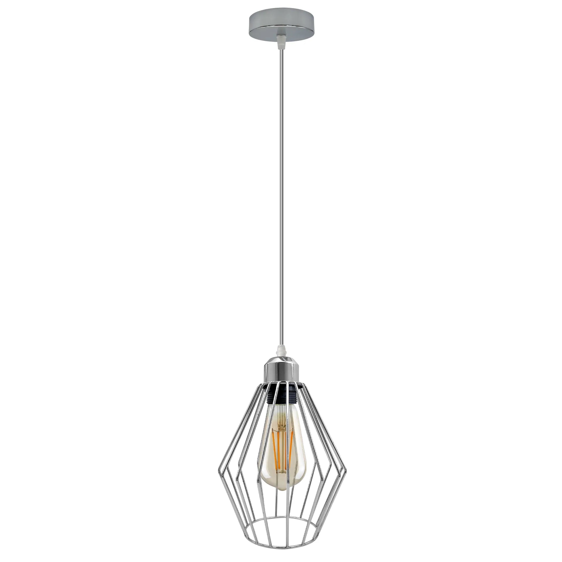 - Deze plafondlamp met open kooi van chroom heeft een ruitvormig ontwerp en geeft de lamp een industriële uitstraling, waardoor hij goed past bij rustieke interieurs.