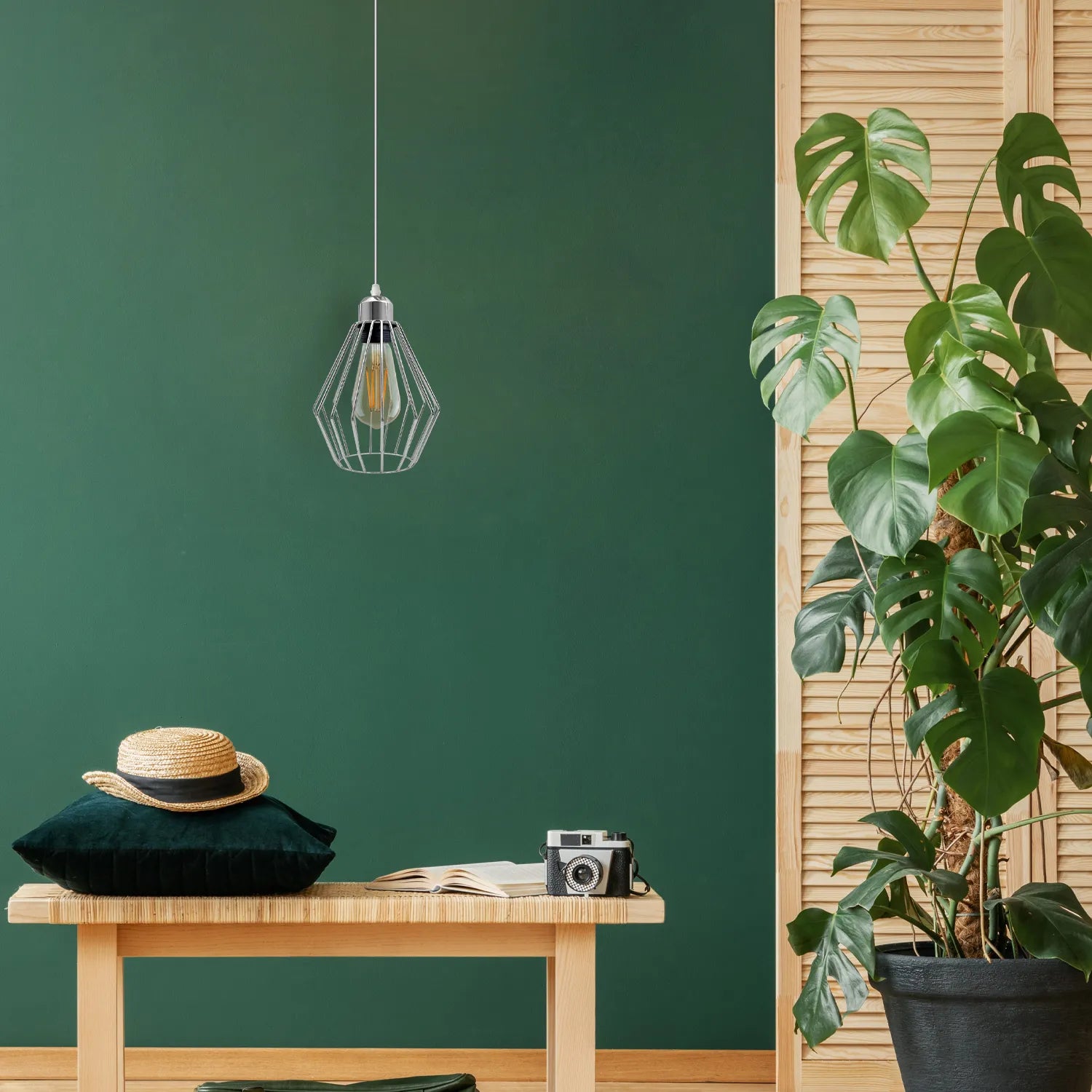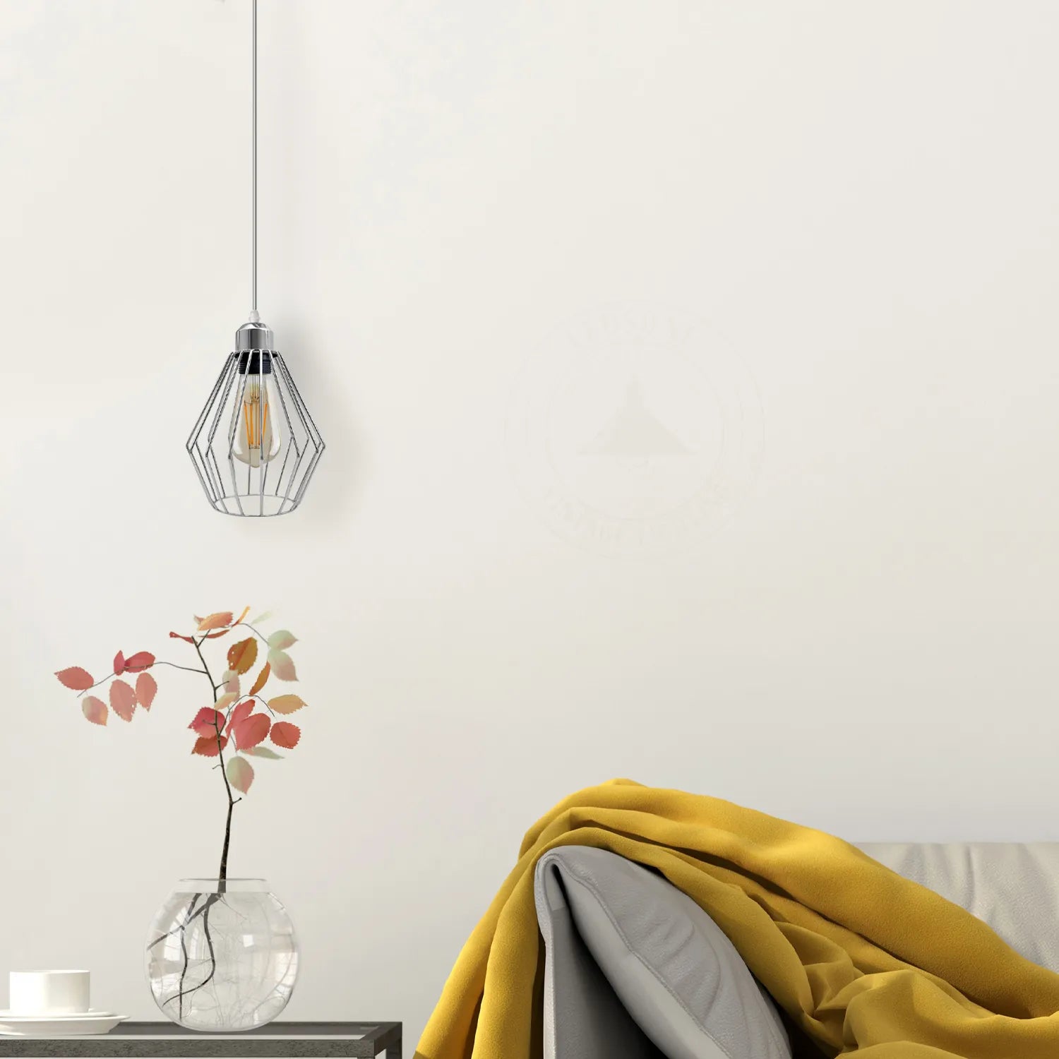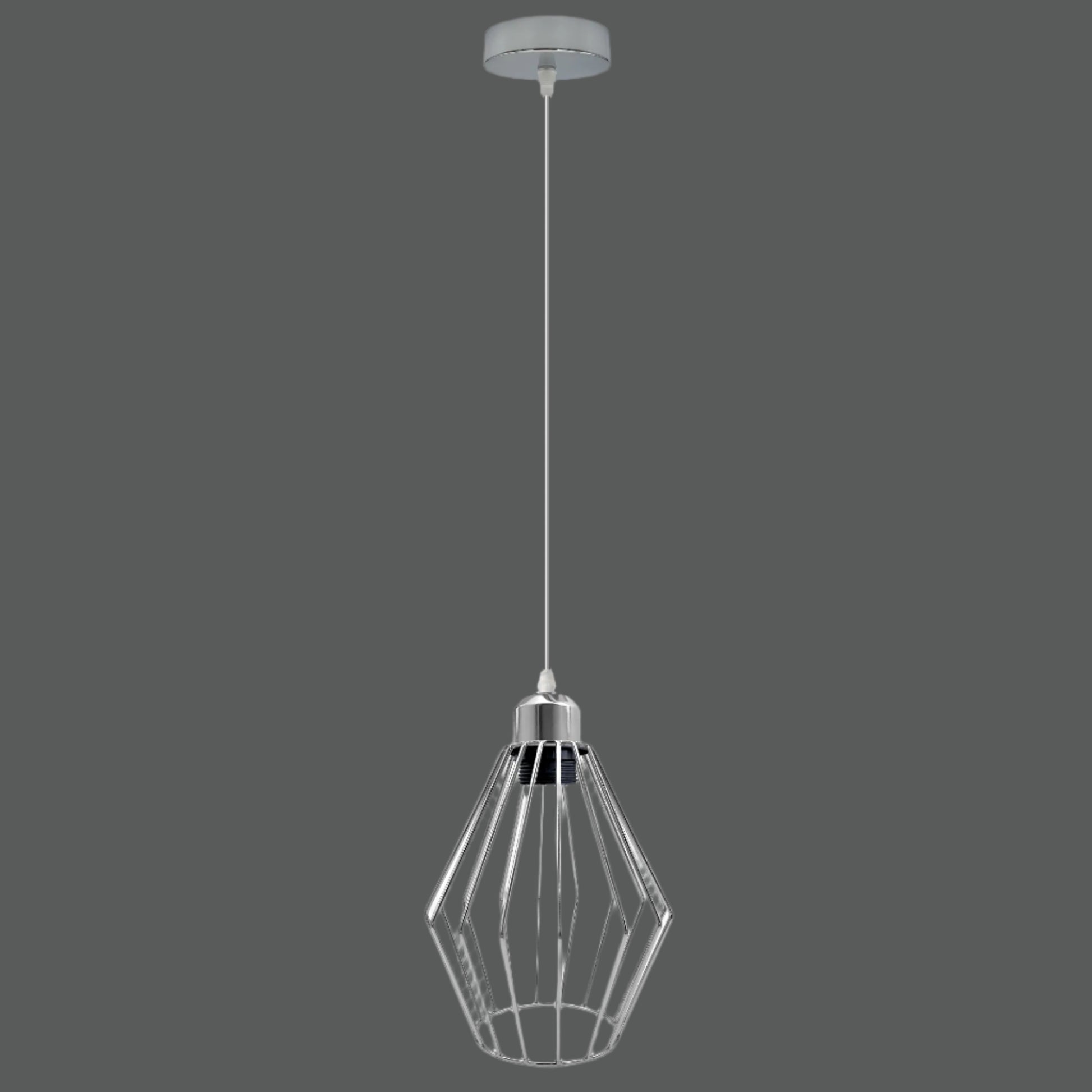 - Deze plafondlamp met open kooi van chroom heeft een ruitvormig ontwerp en geeft de lamp een industriële uitstraling, waardoor hij goed past bij rustieke interieurs.
