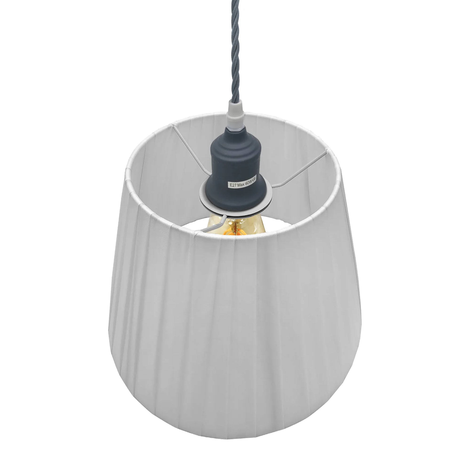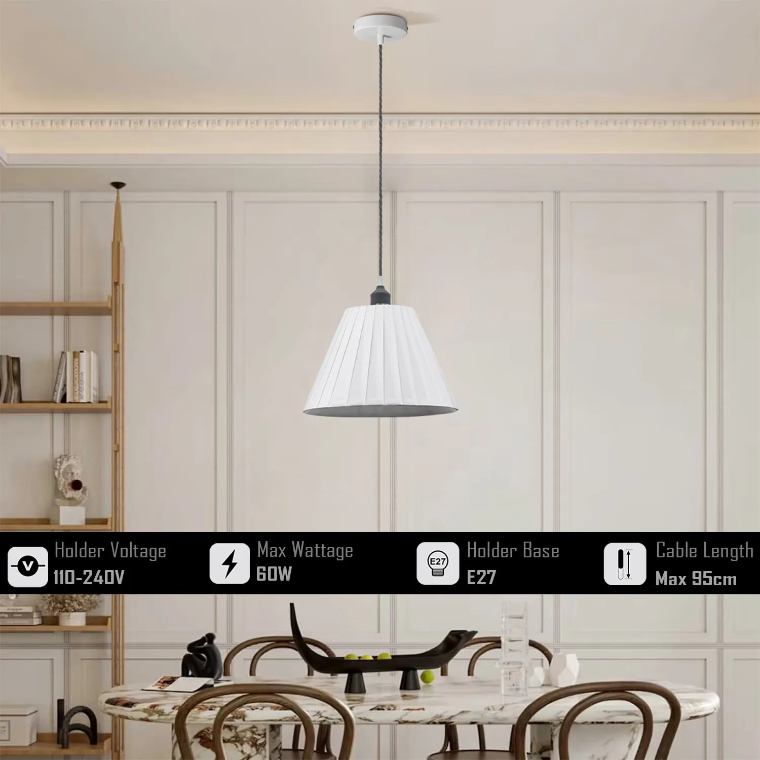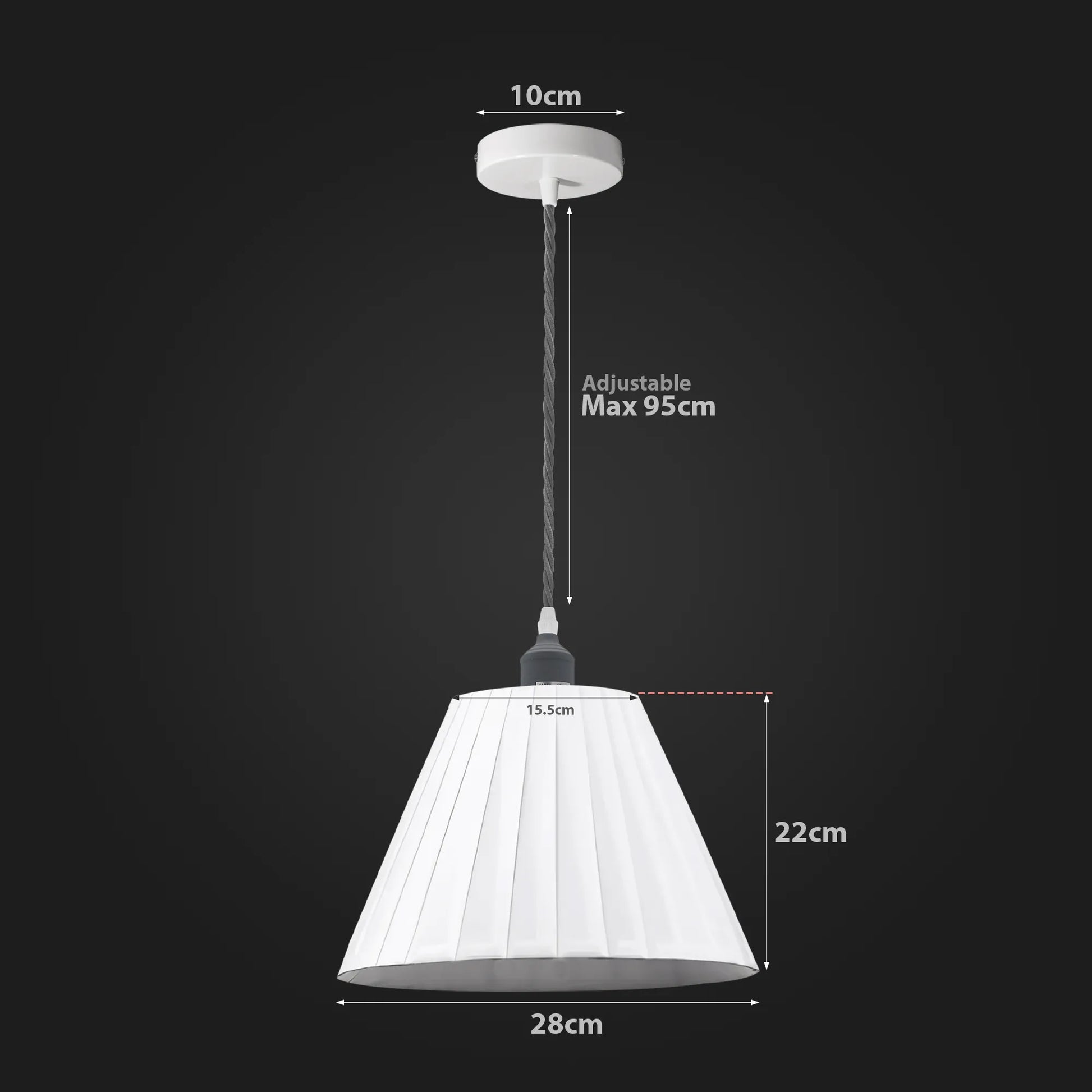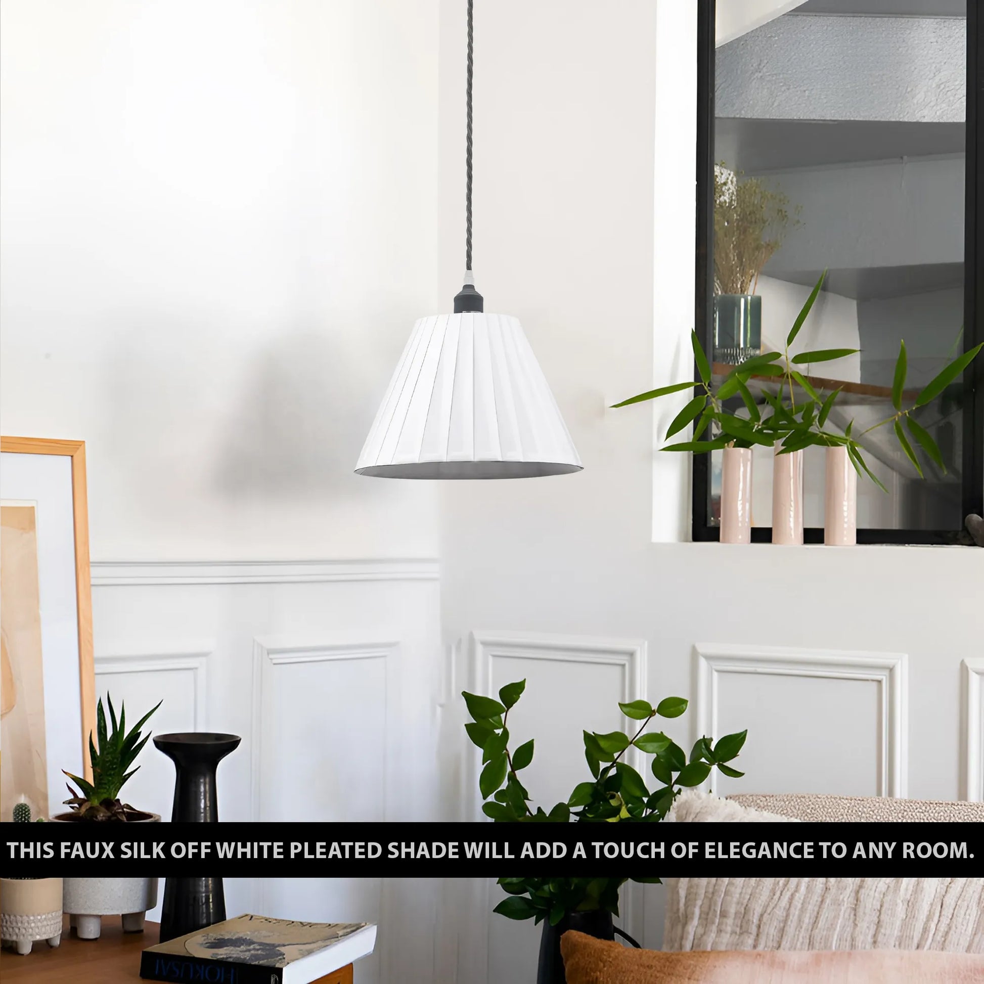 - Deze geplooide lampenkap van imitatiezijde in gebroken wit voegt een vleugje elegantie toe aan elke kamer. De lamp is voorzien van een verbeterde roestwerende verftechniek en hoogwaardig metaal, roestbescherming en duurzaamheid. De kabel is bekleed met stof en heeft een 3-aderige draad.