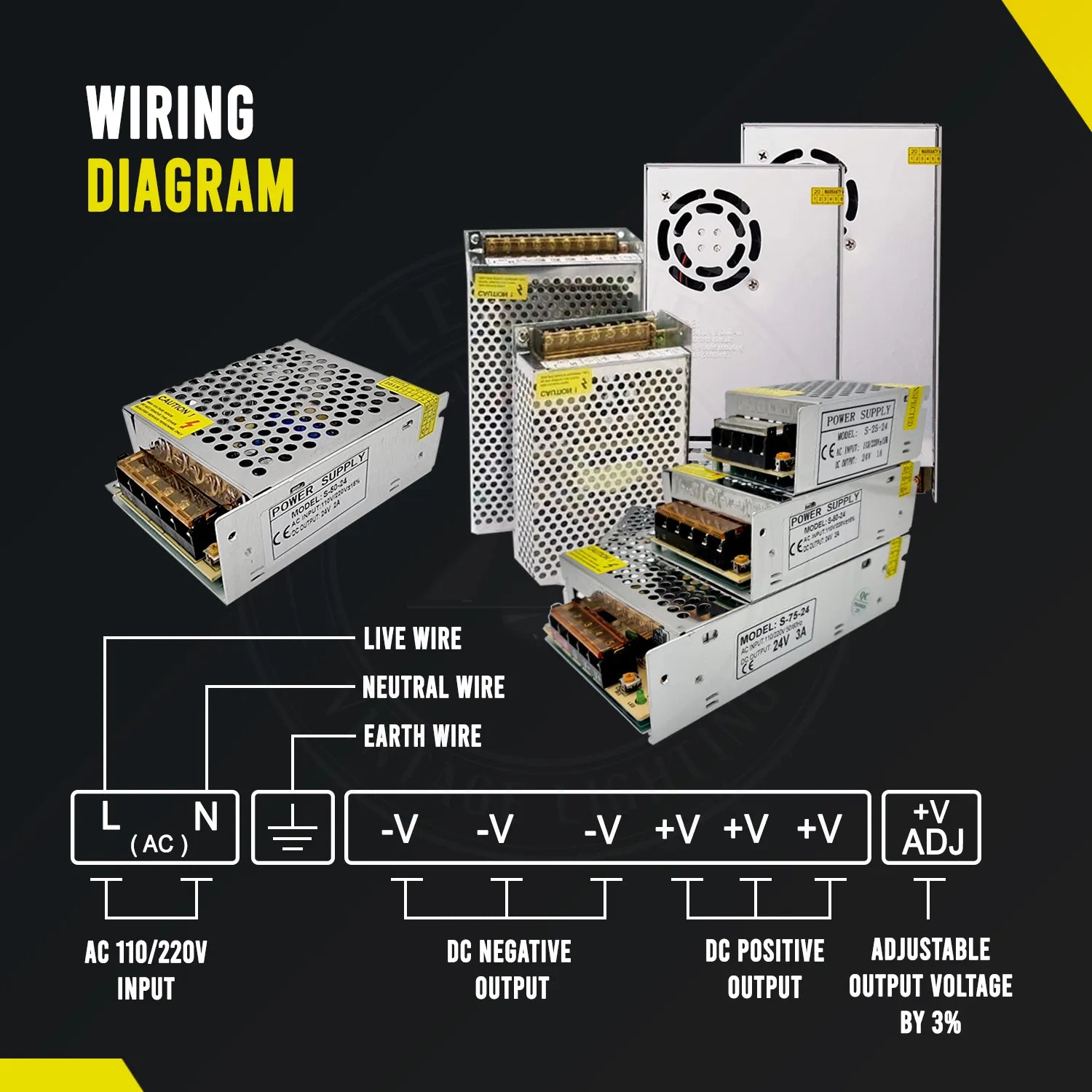 - Deze niet-dimbare schakelende voeding zet 110 V wisselstroom om in 24 V gelijkstroom met een IP20-classificatie.