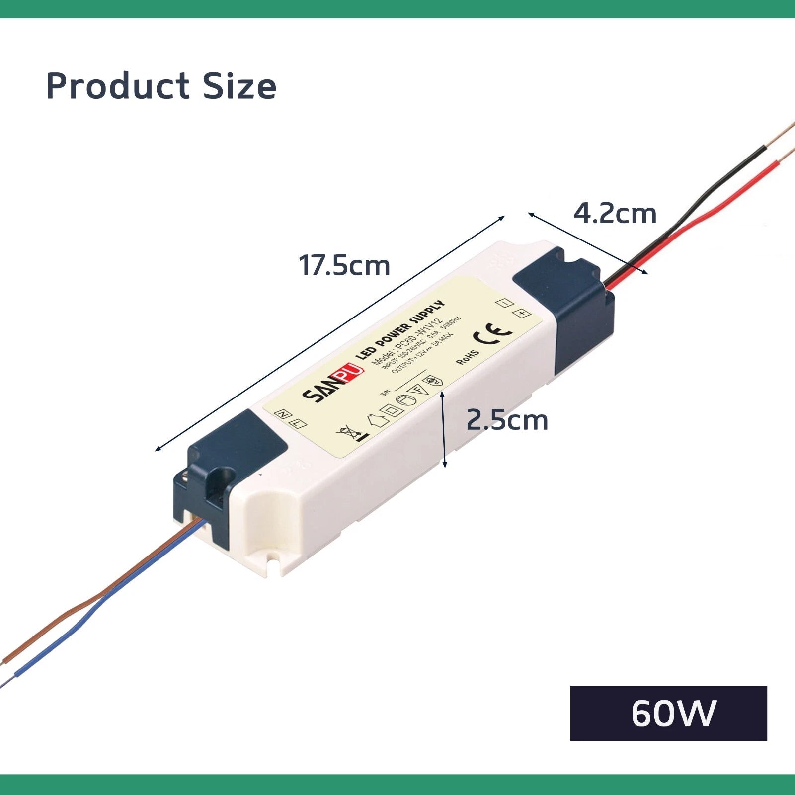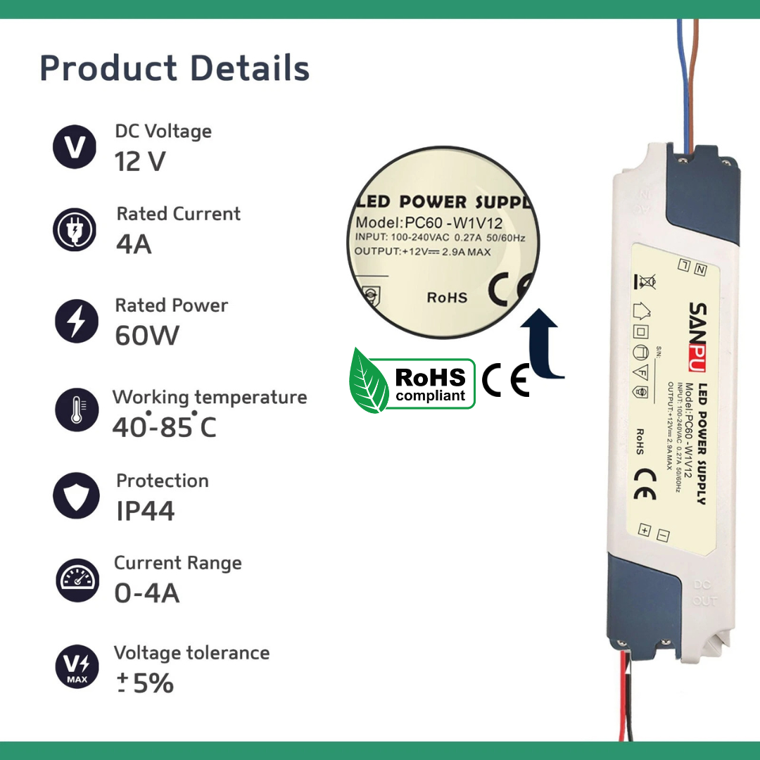 - De voeding accepteert ingangsspanningen van 100-240 V AC en levert een constante uitgangsspanning van 12 V en stroom van 5 A.