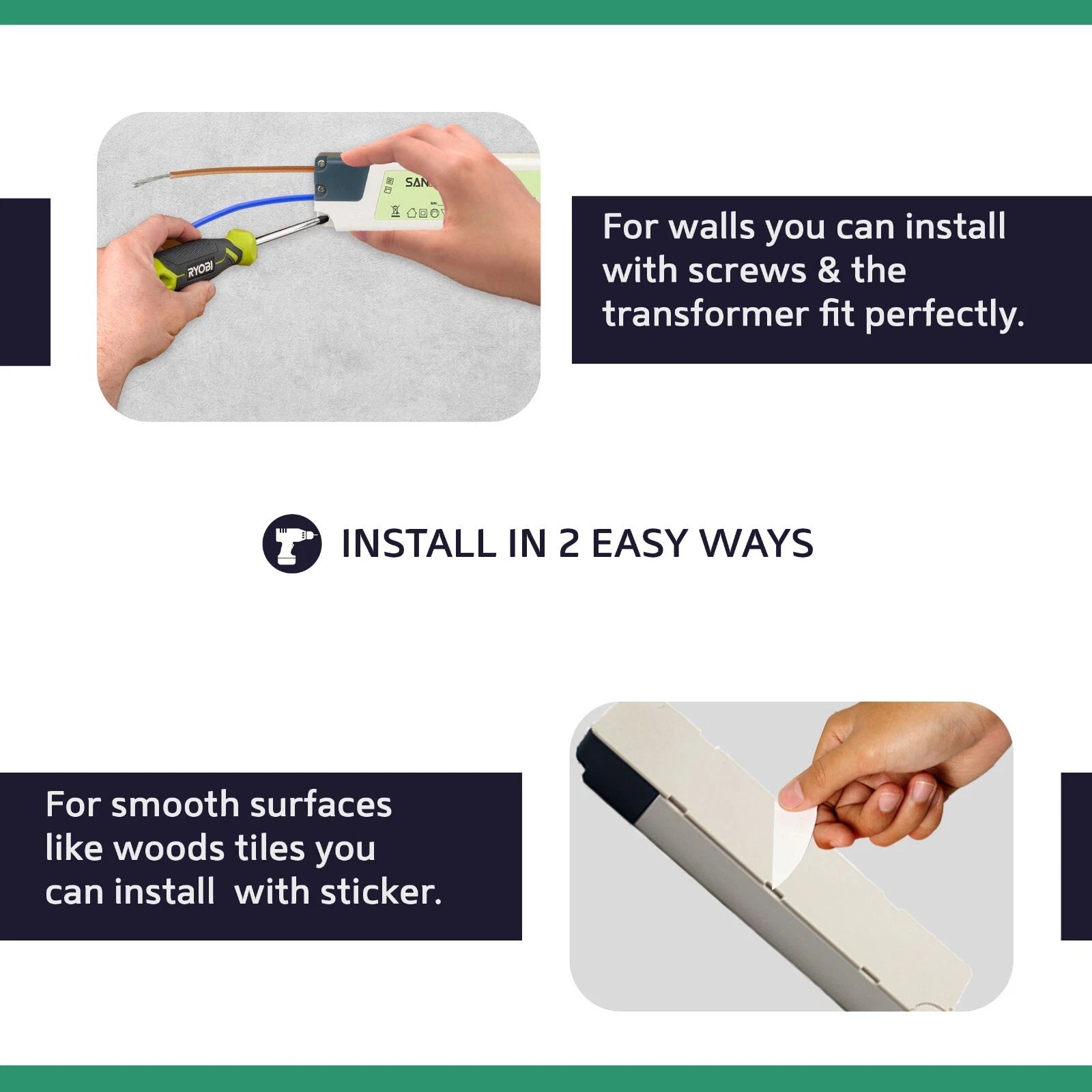 - Bevestig de transformator met schroeven aan de muur, zodat hij goed past. Voor gladde oppervlakken gebruikt u stickers, zodat u hem eenvoudig kunt bevestigen.