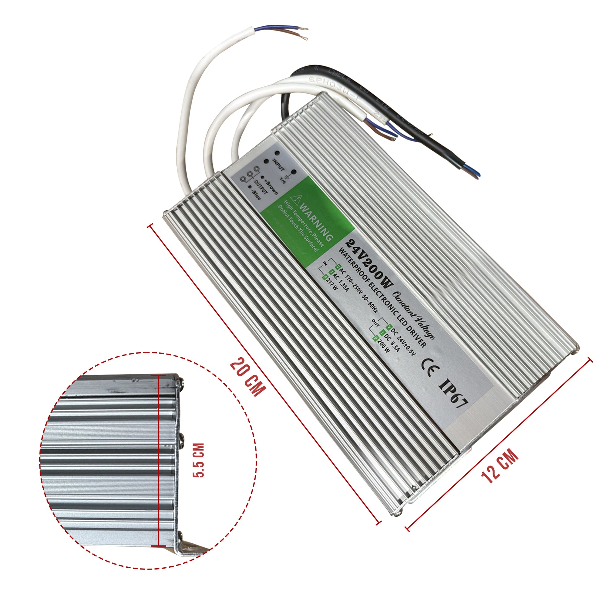 - De LED-driver is ontworpen voor gebruik in een behuizing van aluminiumlegering met rubberen afgedichte kabels, waardoor de LED-driver een IP67-waterdichte beschermingsgraad heeft.