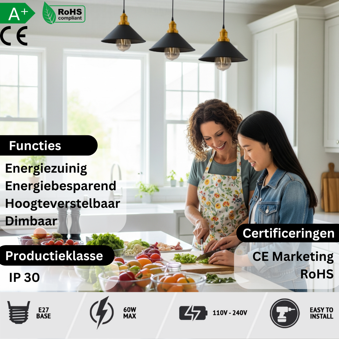 Compatibel met standaard E27-lampen, zodat je je verlichting kunt aanpassen om de ideale sfeer te creëren, of je nu houdt van een warme, gezellige gloed of heldere, energiezuinige verlichting.