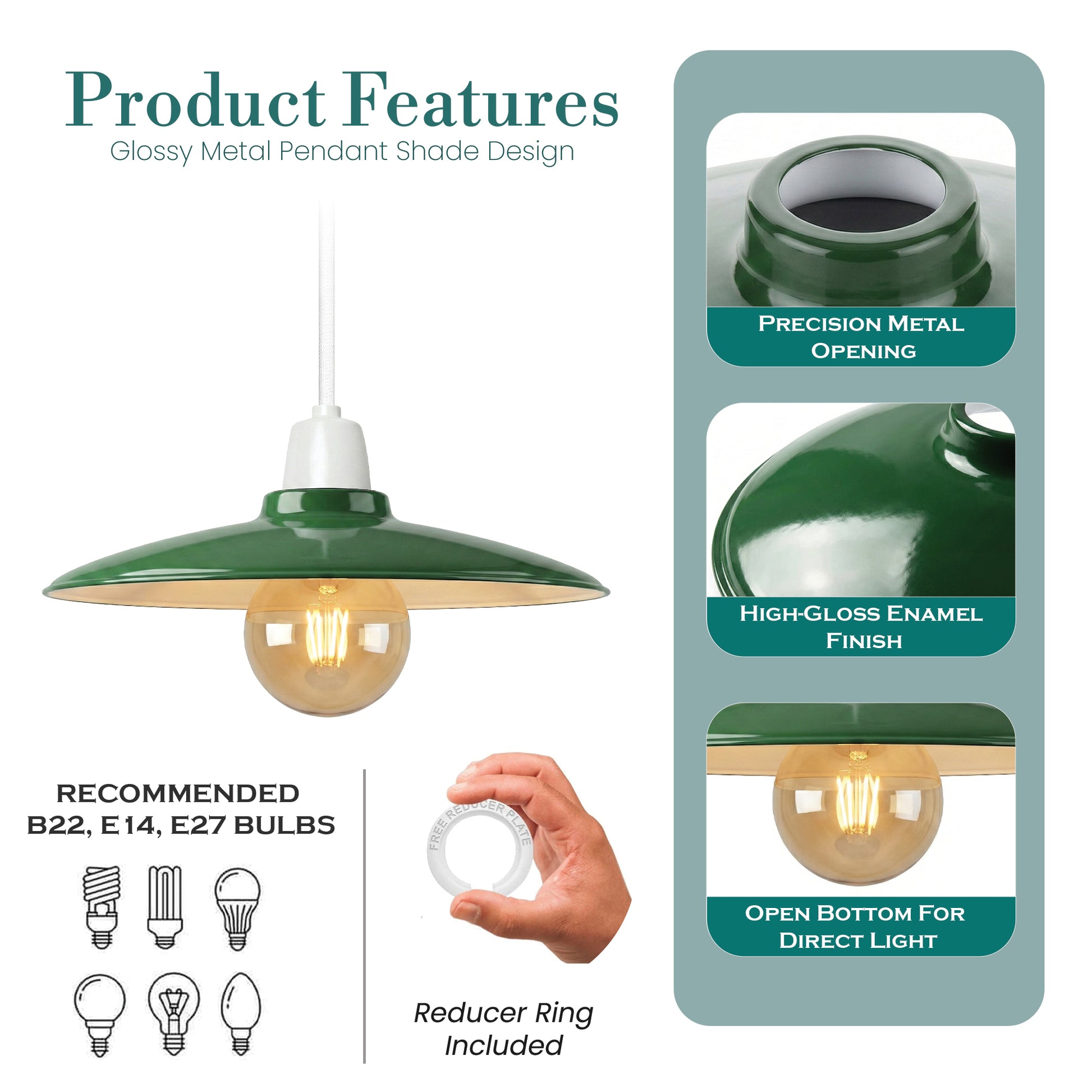 - Universal Compatibility: Designed for E27 fitting bulbs (LED, Edison, or filament). Includes a reducer ring to fit B22 and E14 sockets.