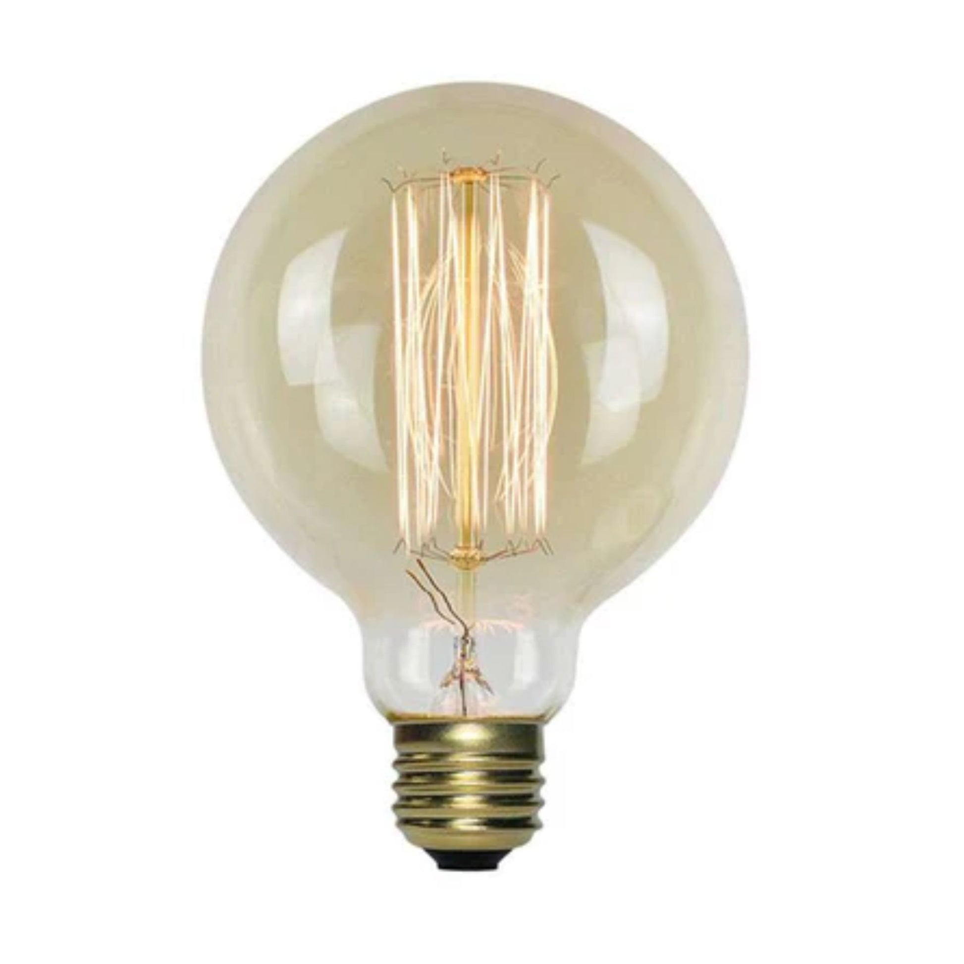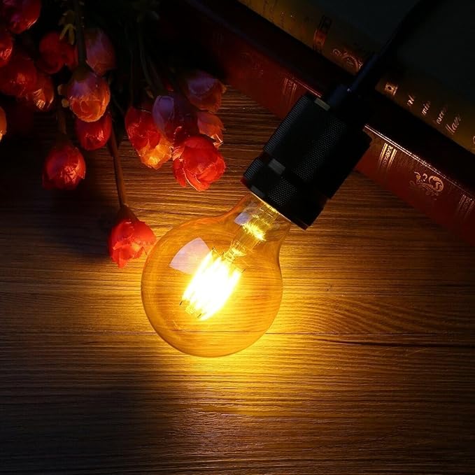 - De G95 LED filamentlamp heeft een klassiek design met zijn bolvormige vorm en amberkleurig glas, waardoor de gloeidraad zichtbaar is.
