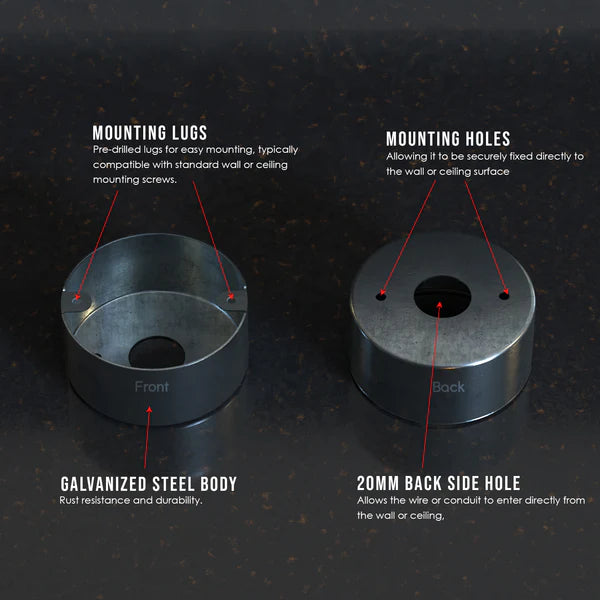 - De gegalvaniseerde metalen inbouwdoos is ontworpen voor verlichting en andere elektrische toepassingen en maakt veilige en georganiseerde routering van elektrische bedrading mogelijk.