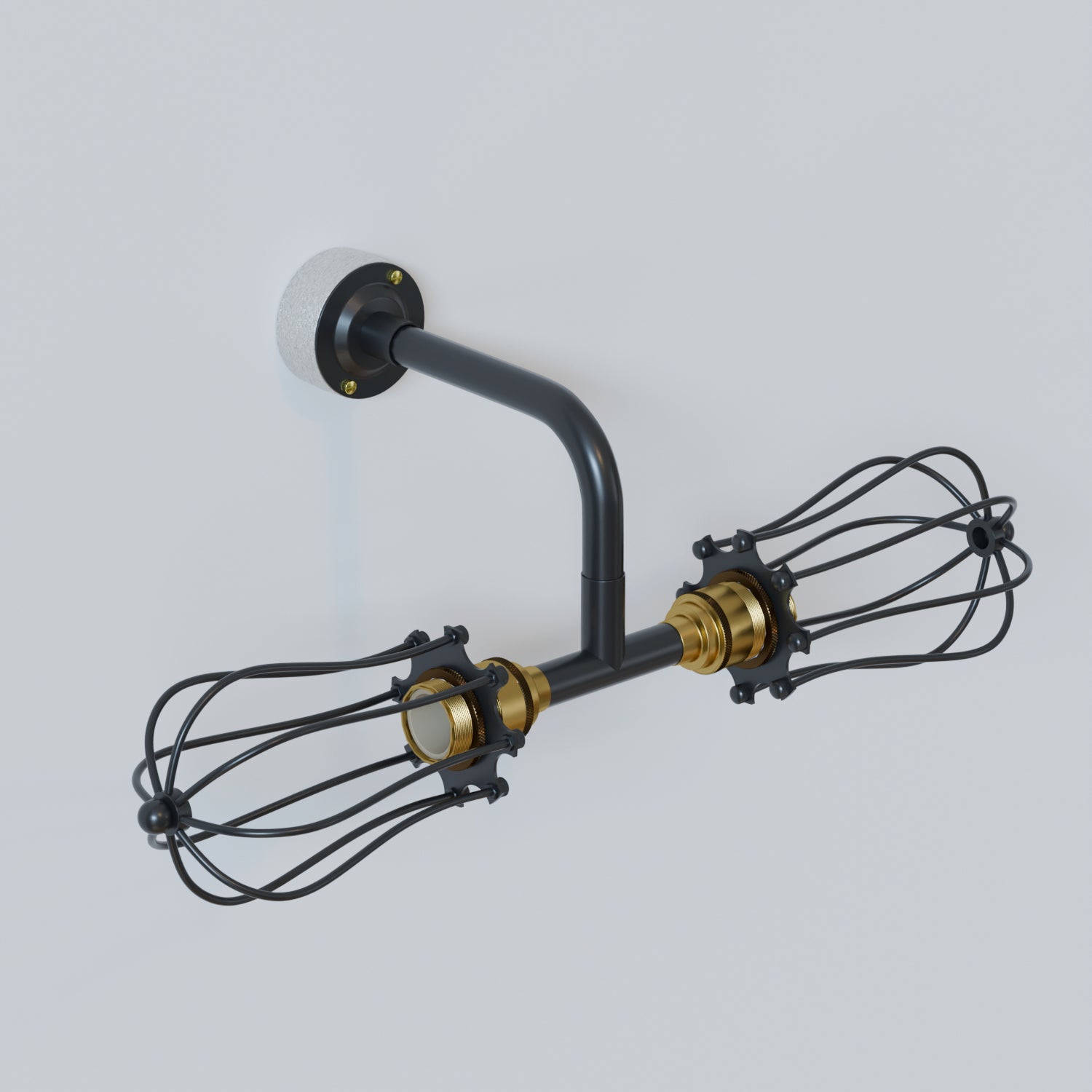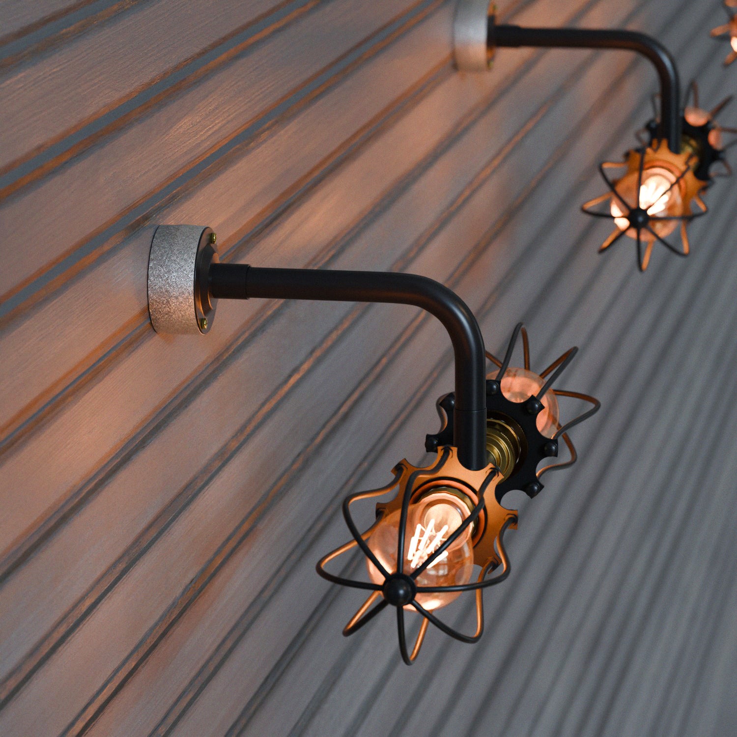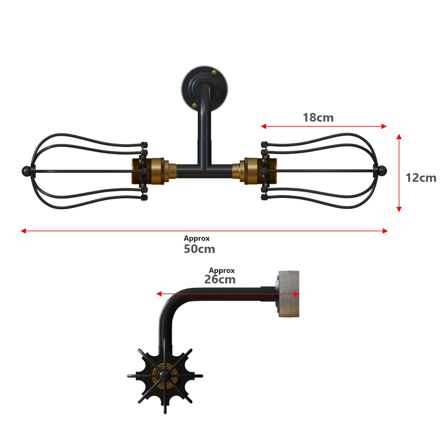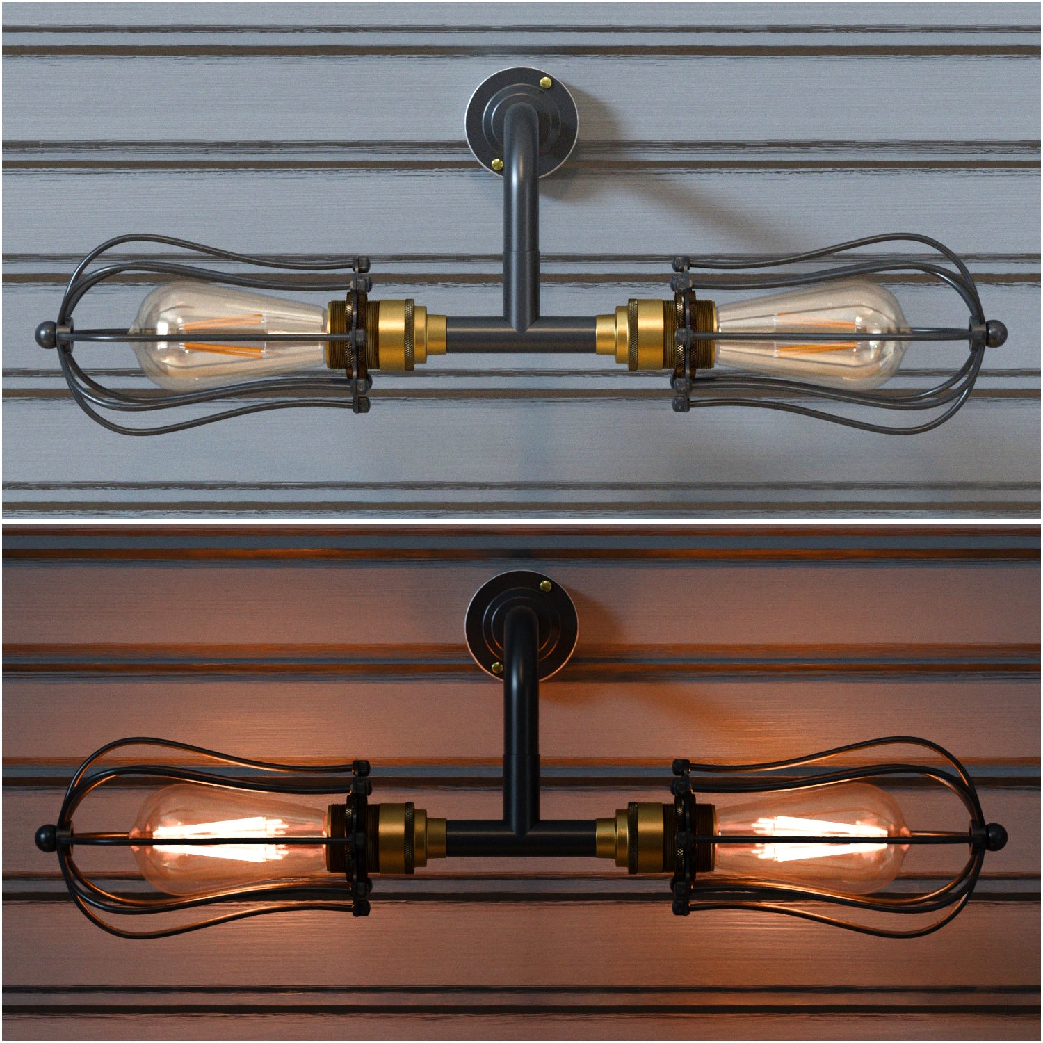 - Deze Conduit-wandlamp heeft een vintage-stijl ontwerp met twee kooivormige behuizingen en voegt een rustieke en industriële charme toe aan elke ruimte.