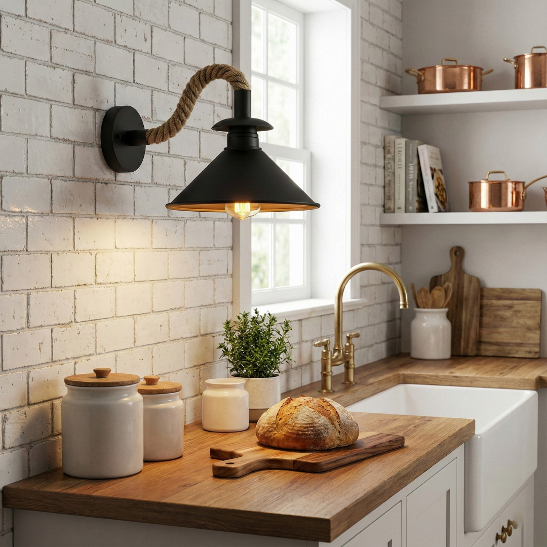 • Stijlvolle, vintage wandlamp met een gedraaide, met henneptouw omhulde kabel met kap, ideaal voor interieurdecoratie.