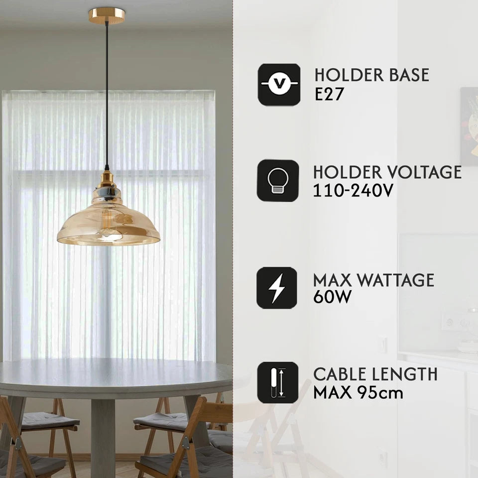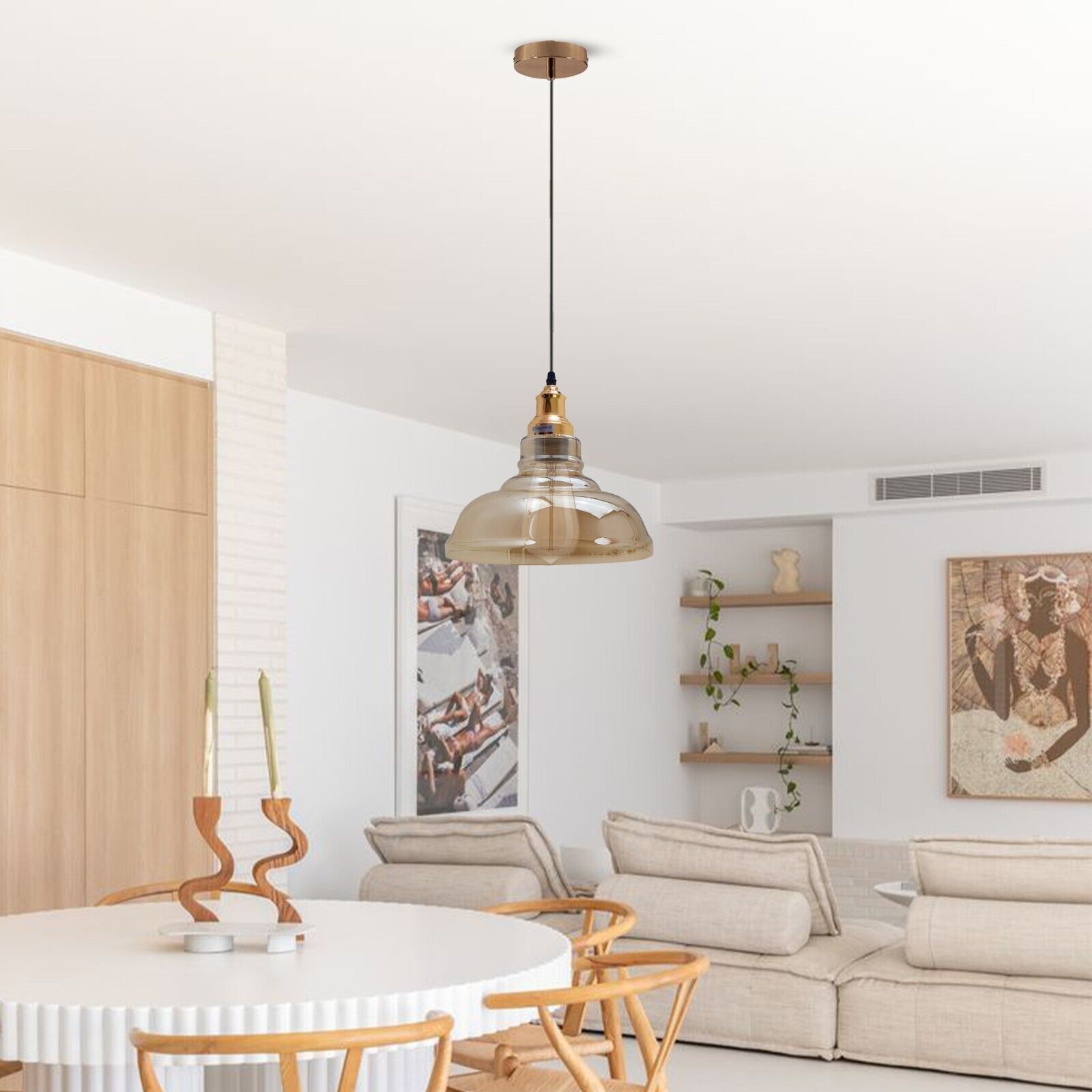 - Deze hanglamp is geïnspireerd op vintage design en heeft een amberkleurige glazen kap die een warme en uitnodigende gloed uitstraalt die doet denken aan klassieke verlichtingsarmaturen.