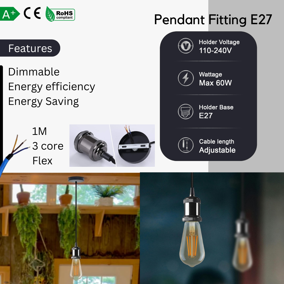 - Ziet er fantastisch uit als er een gloeilamp in vintage-stijl wordt gebruikt. Lampenkapbevestigingsring zodat er een lampenkap op kan worden gemonteerd.
