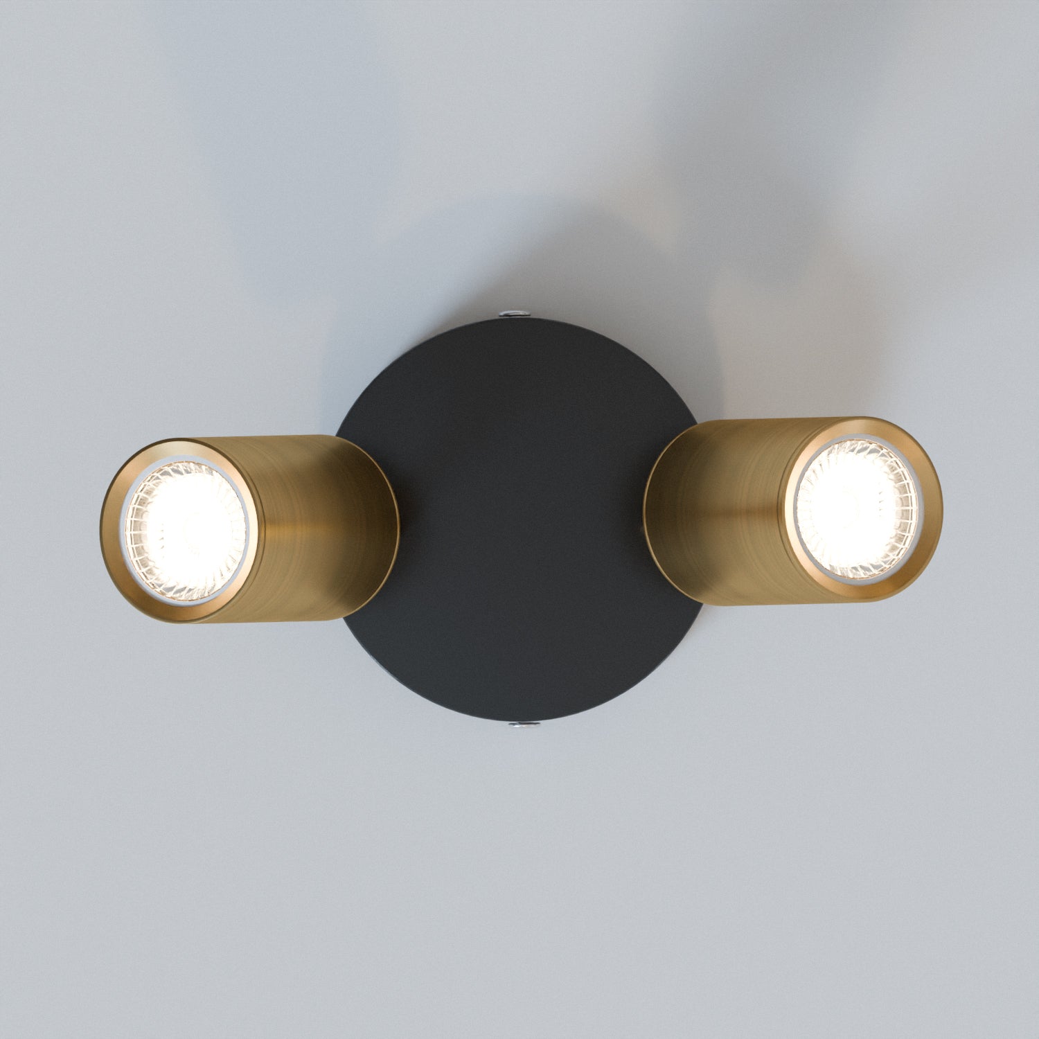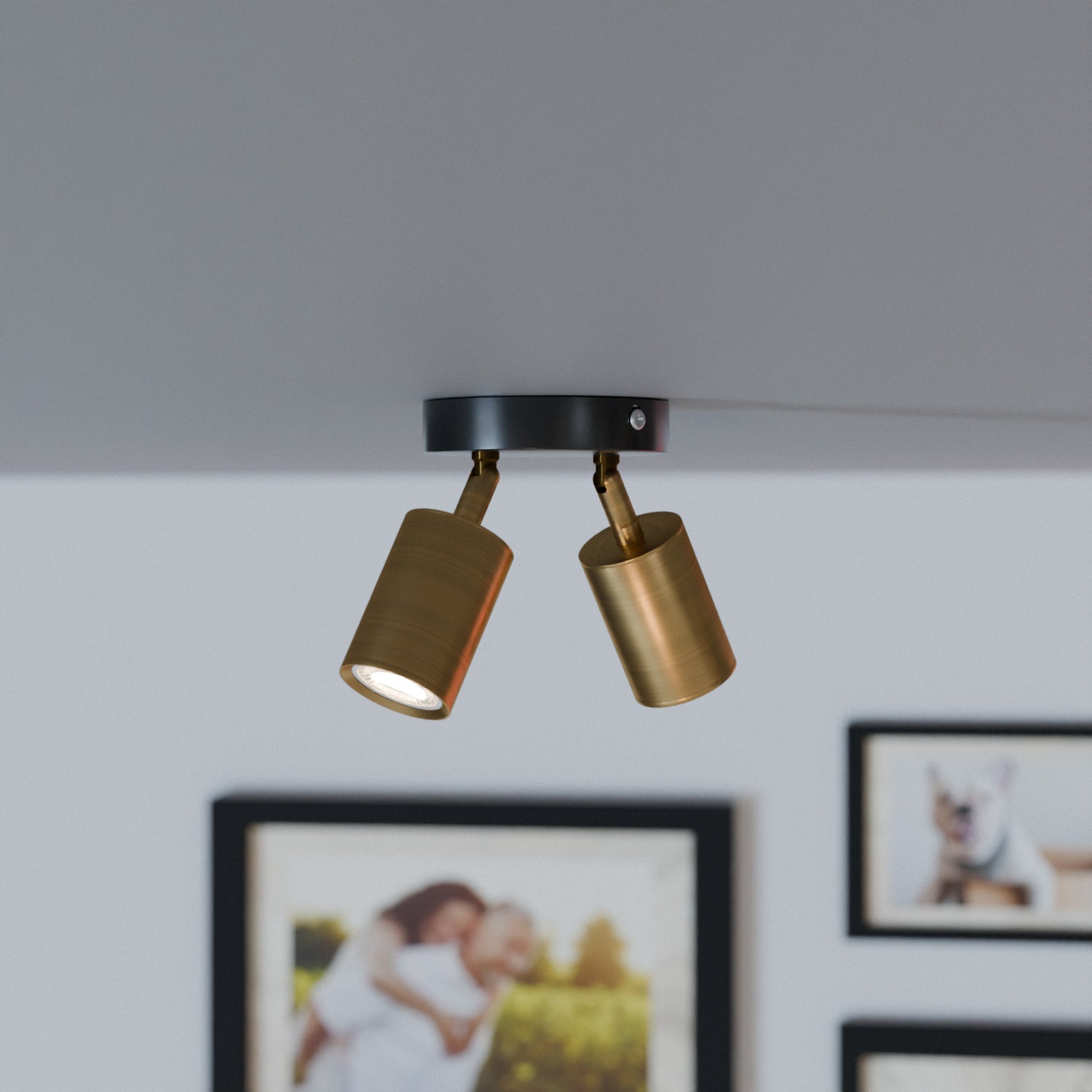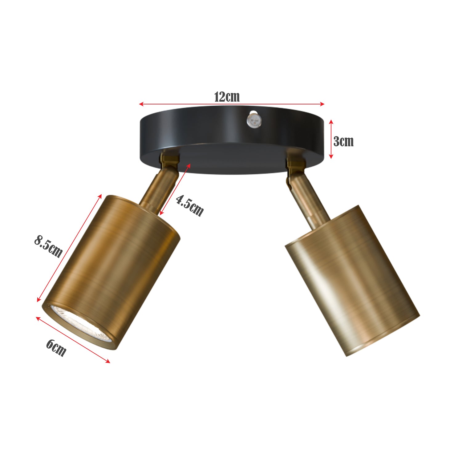 - Dubbele, verstelbare plafondspot met draaibare metalen koppen, cilindrisch ontwerp, compacte structuur en veelzijdige ontwerpkenmerken voor verschillende interieurs.