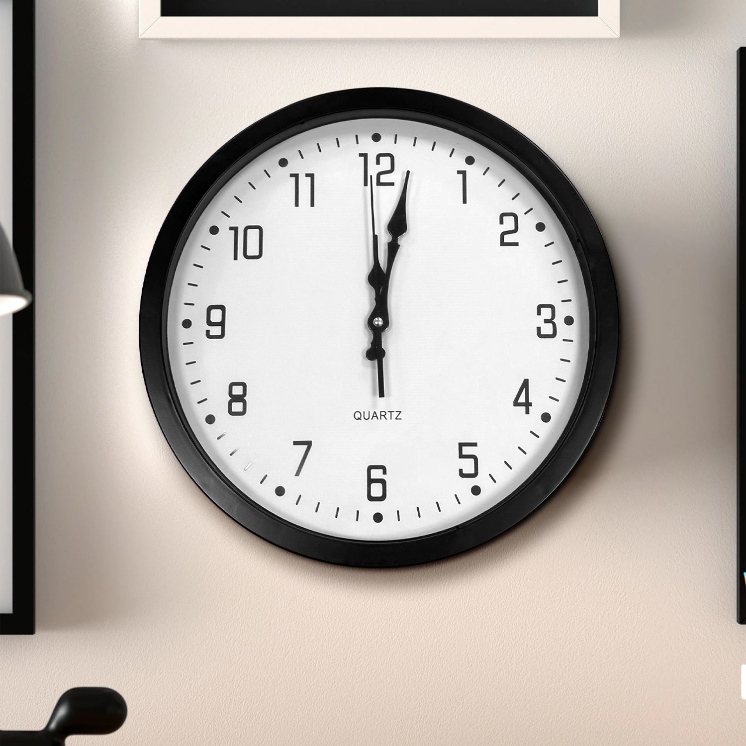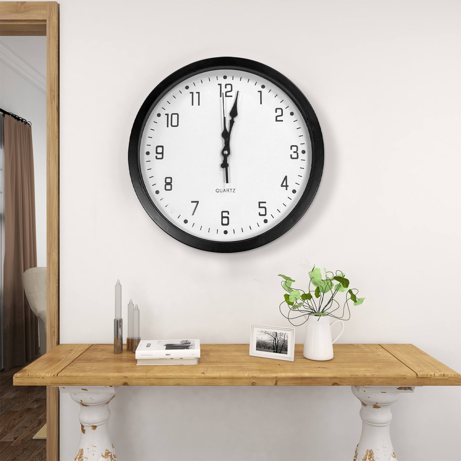 - De wandklok heeft een ronde wijzerplaat en een groot analoog cijferdisplay voor een duidelijke en leesbare weergave.