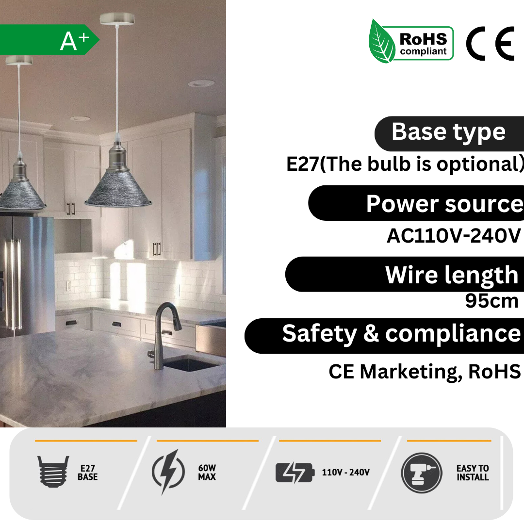 - E27-lampvoet, u kunt elke gewenste lamp met E27-interface kiezen.