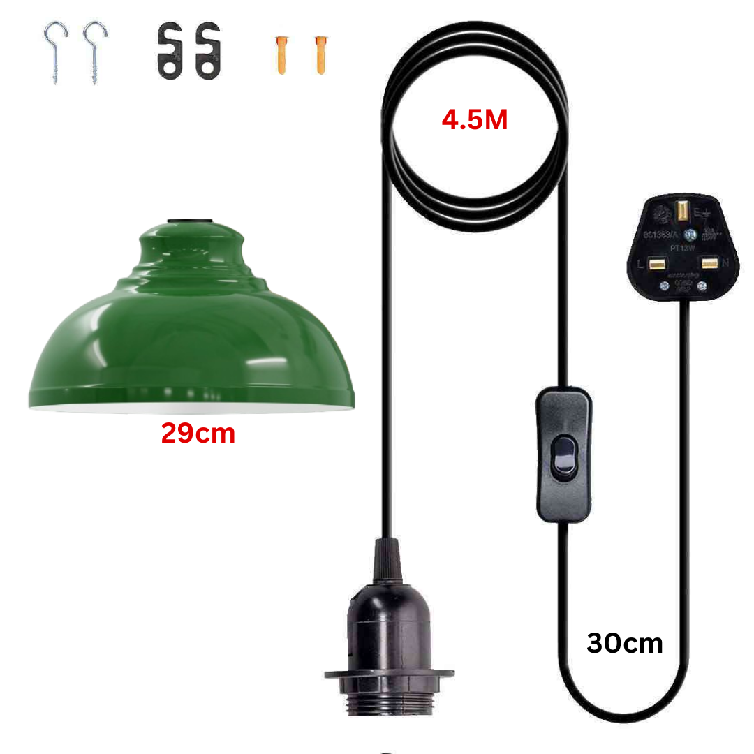 Package Includes 1x Metal Shade (29cm), 1x Plug-in Cord with E27 Holder, 2x Metal Wheel Hook, 2x Tighter Hook