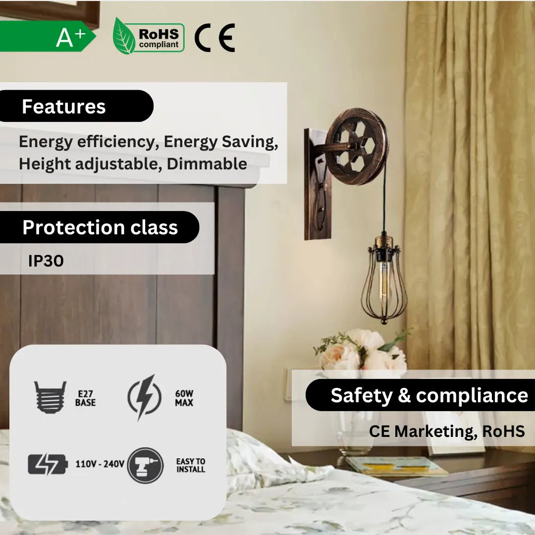 Voeg een vleugje industriële charme toe aan je huis met onze vintage katrol wandlamp . Deze unieke lamp heeft een rustieke houten katrol en een metalen kooikap , wat zorgt voor een tijdloze en stijlvolle look .