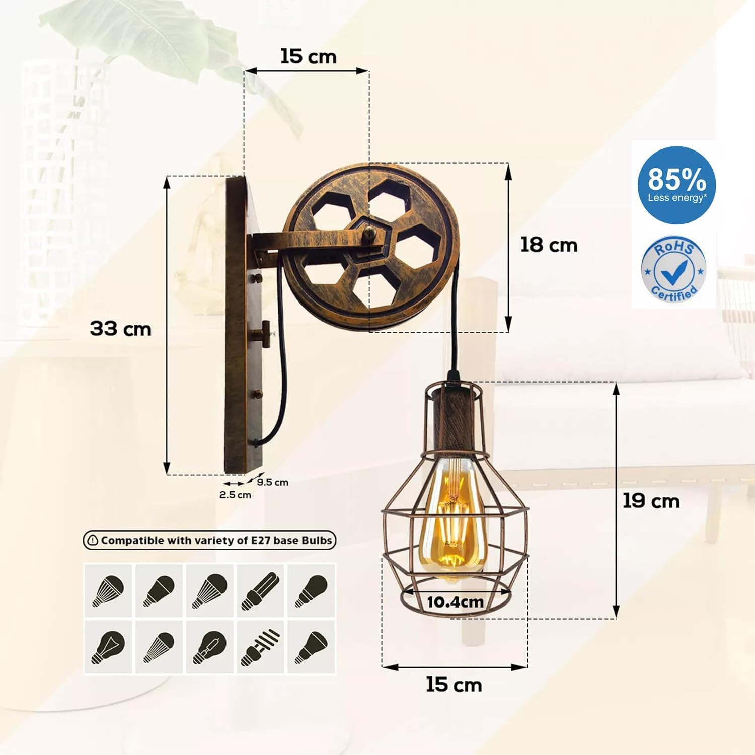 - Energiezuinig: Geschikt voor E27-lampen (niet meegeleverd) voor energiebesparende verlichting.