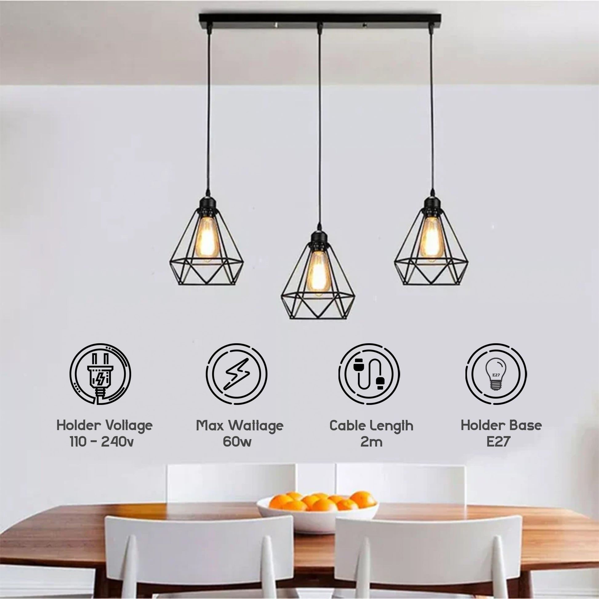 - 3 x Lamphouder met 95 cm kabel (inclusief ST64 E27 gloeilampen)