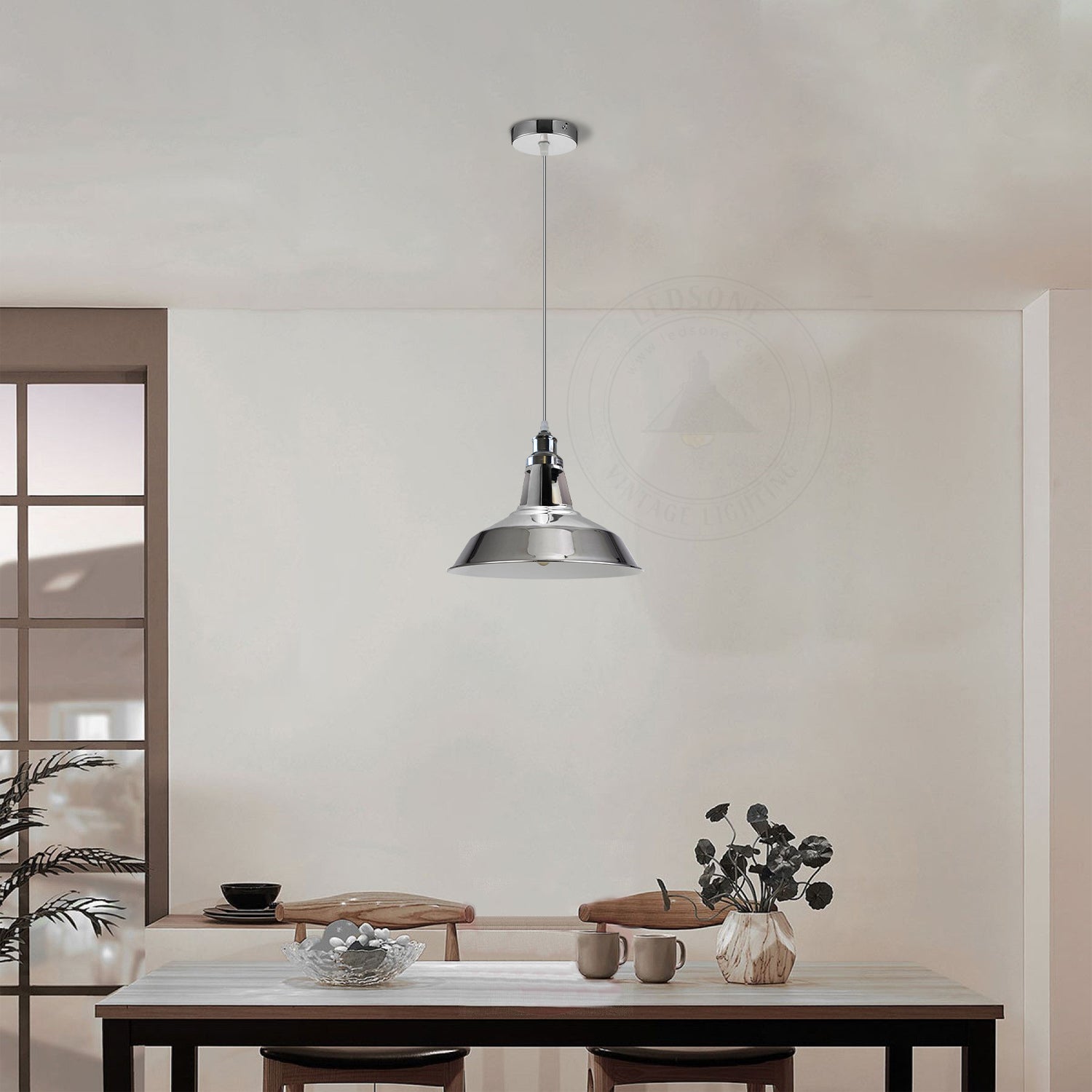 - Deze eenvoudige, strakke hanglamp heeft een chromen afwerking voor een moderne look.