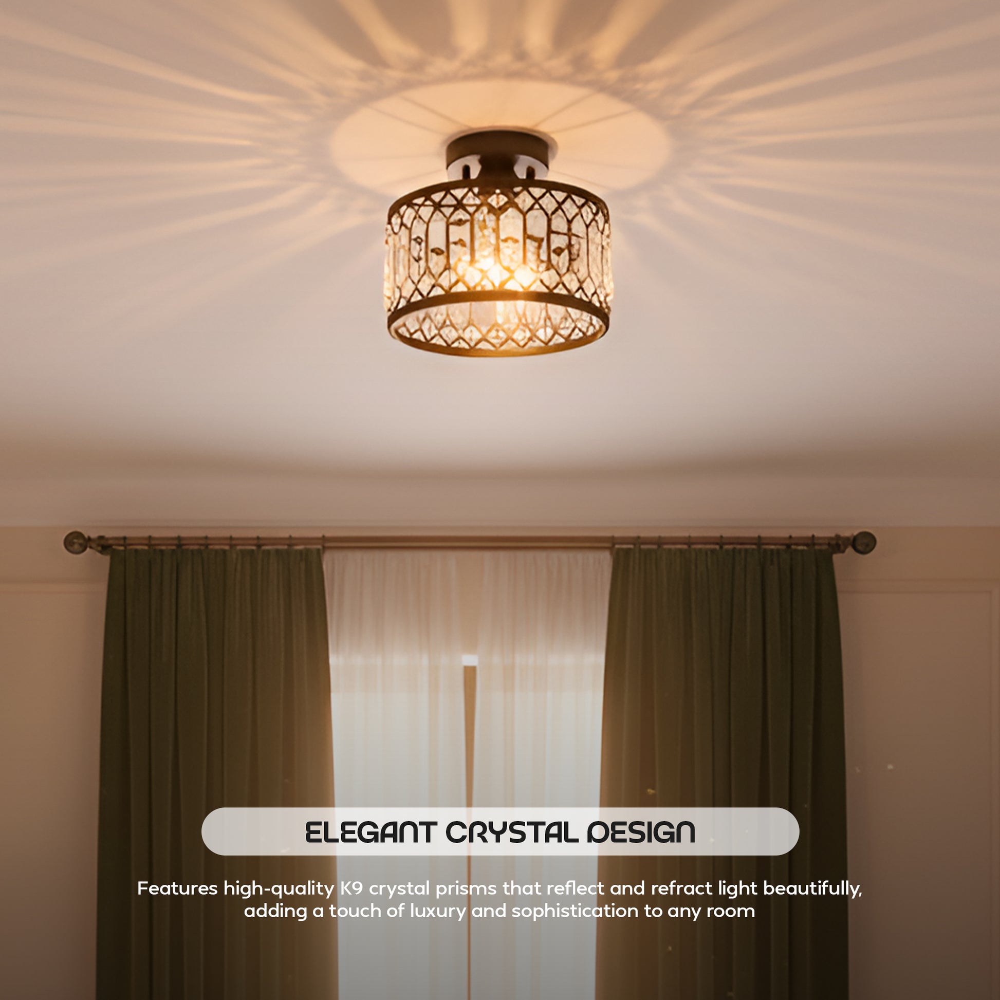 - Elevate your home with the striking elegance of our K9 Crystal Flush Mount Ceiling Light.