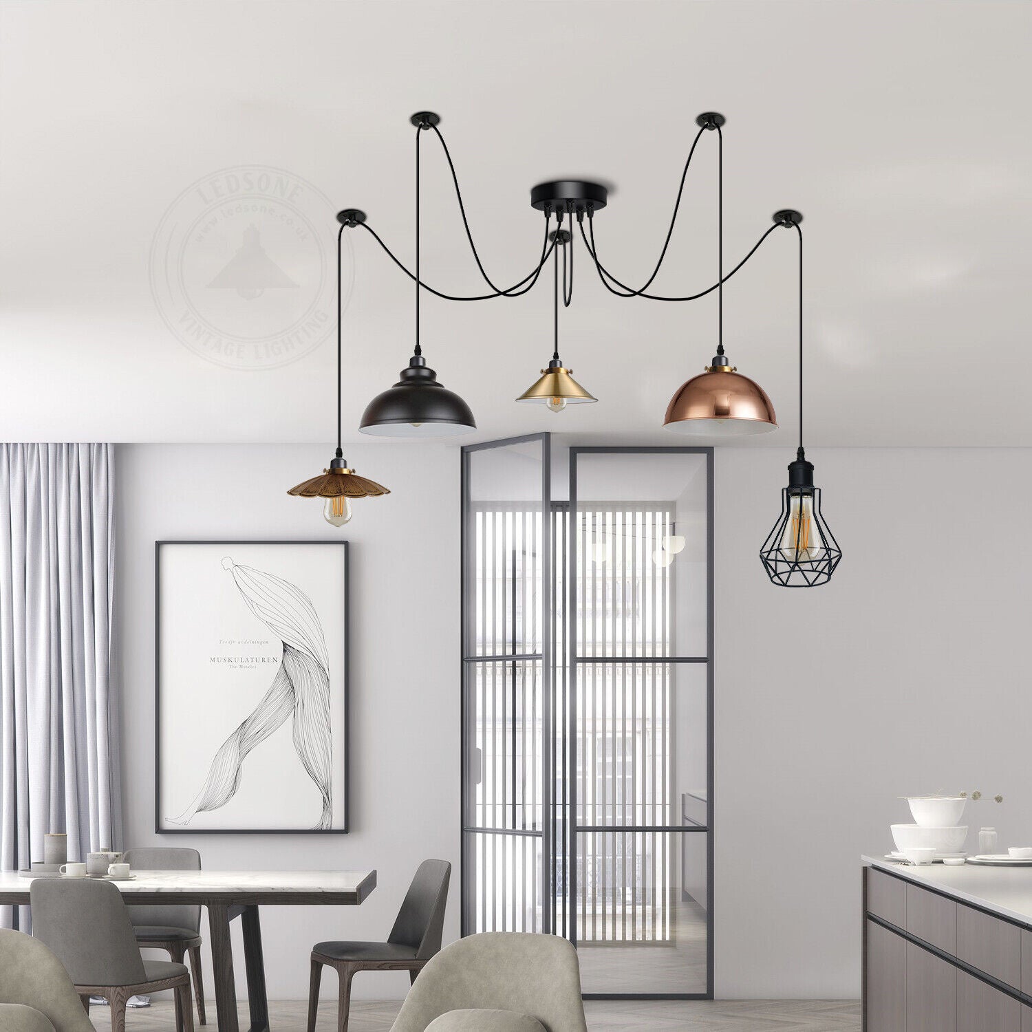 - Kenmerken: 5 Outlet Metal Spider hanglamp met 5 verschillende kappen: gebogen, koepelvormige, kegelvormige, parapluvormige en geometrische kooivormige kappen.