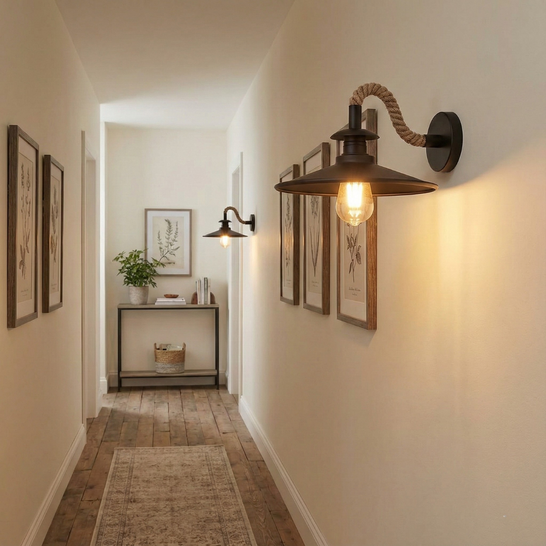 • Satylish vintage wall light fixture featuring a twisted hemp rope-covered cable with shade, ideal for interior decoration.
