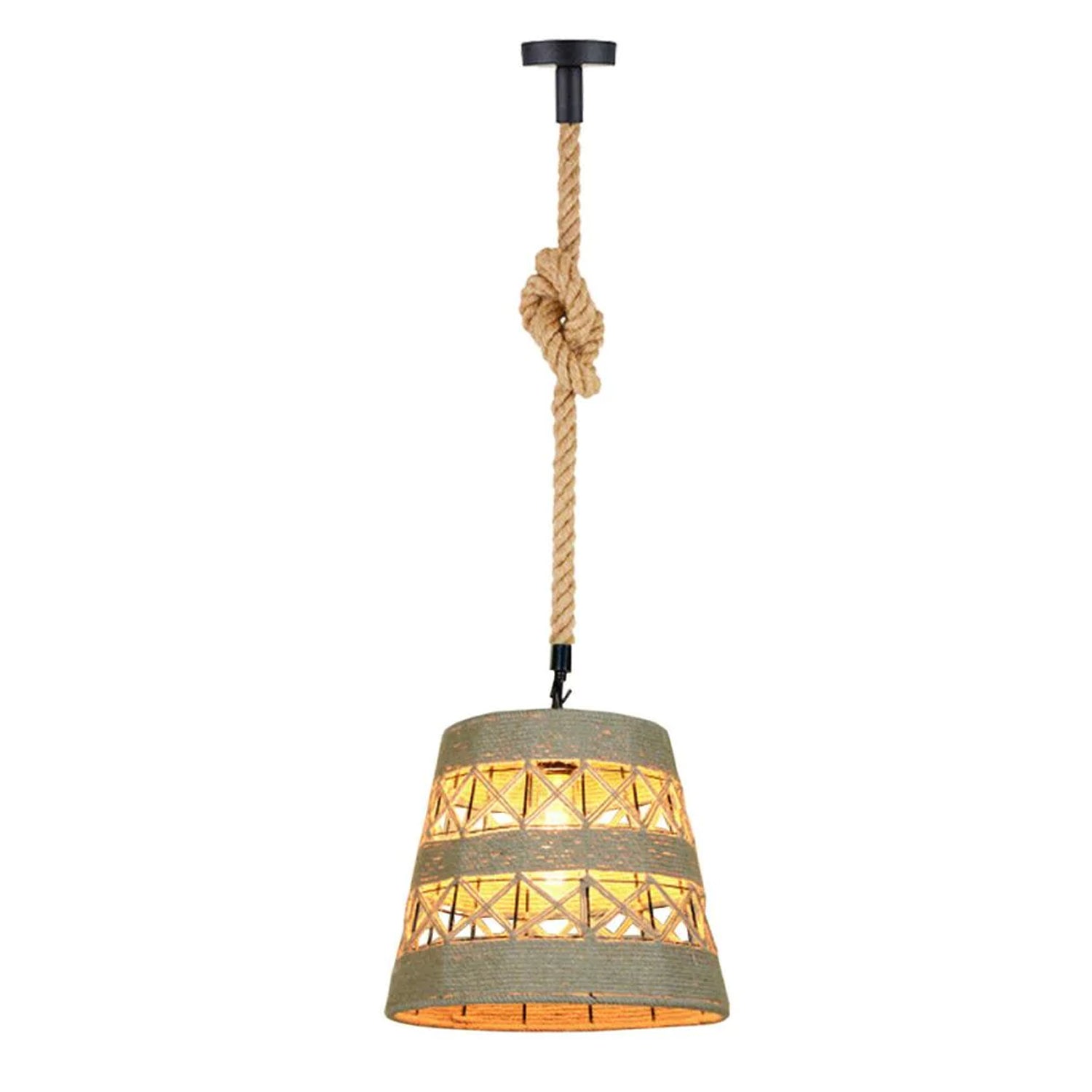 De kroonluchter, gemaakt van handgeweven henneptouw in een kooivormige lampenkap, straalt een moderne, industriële charme uit.