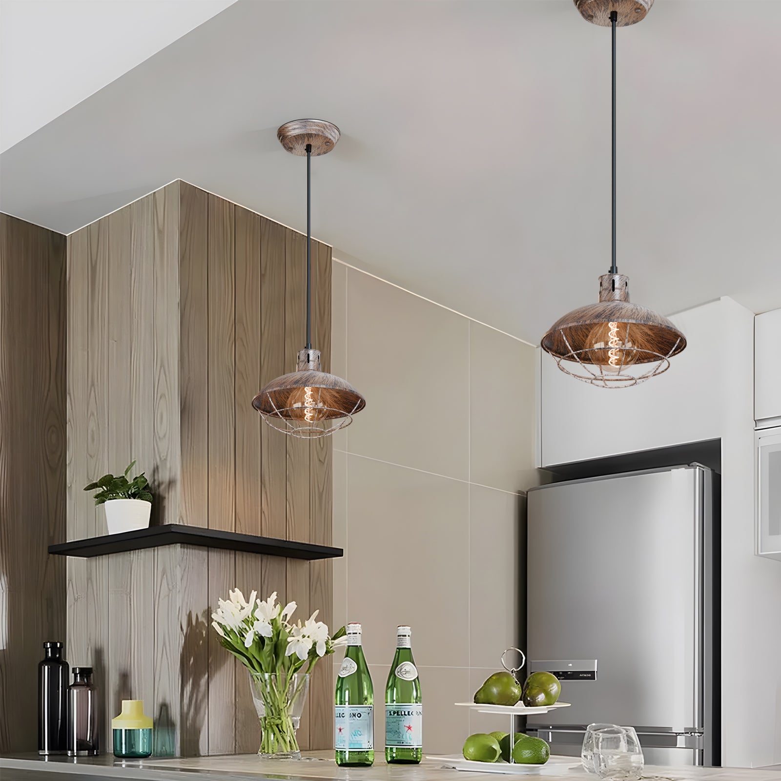 - De hanglamp heeft een metalen afwerking met een verweerde, ouderwetse draadkooi rond de lamp die zowel bescherming als veiligheid biedt.
