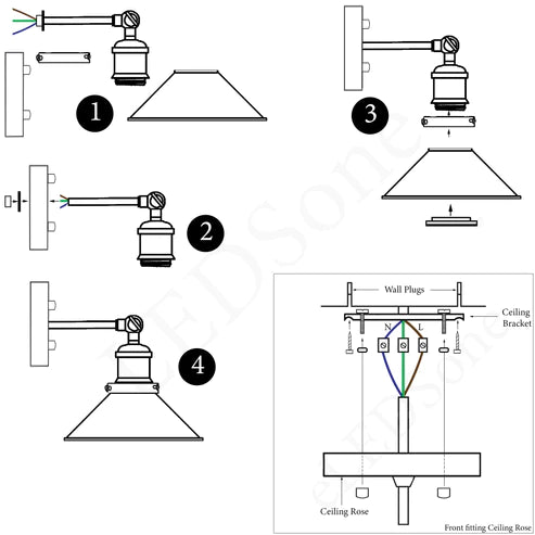 - 1 x Wandlampset. (1 x Groene kap, 1 x E27-fitting met arm, 1 x Wandfitting met accessoires)